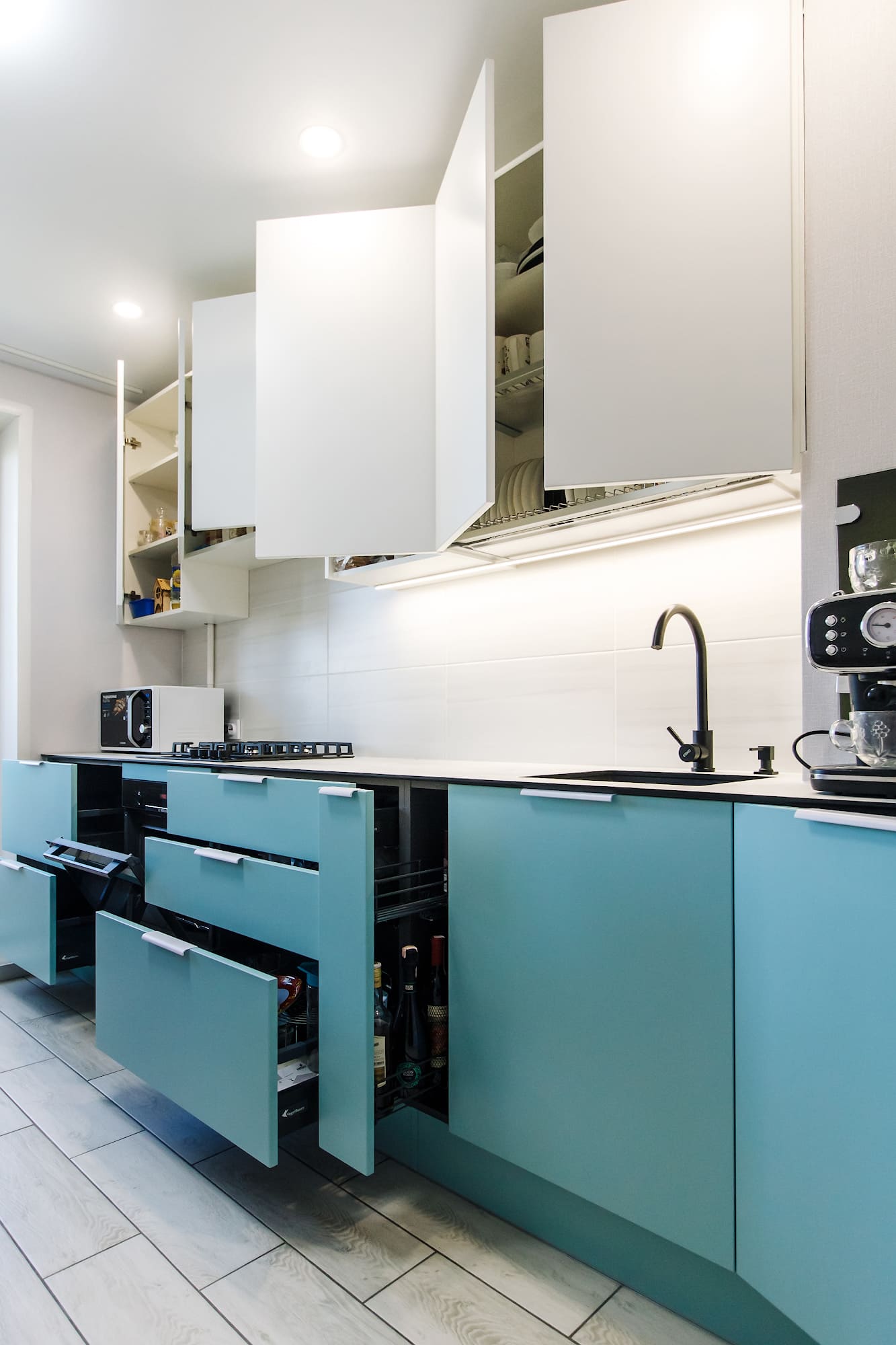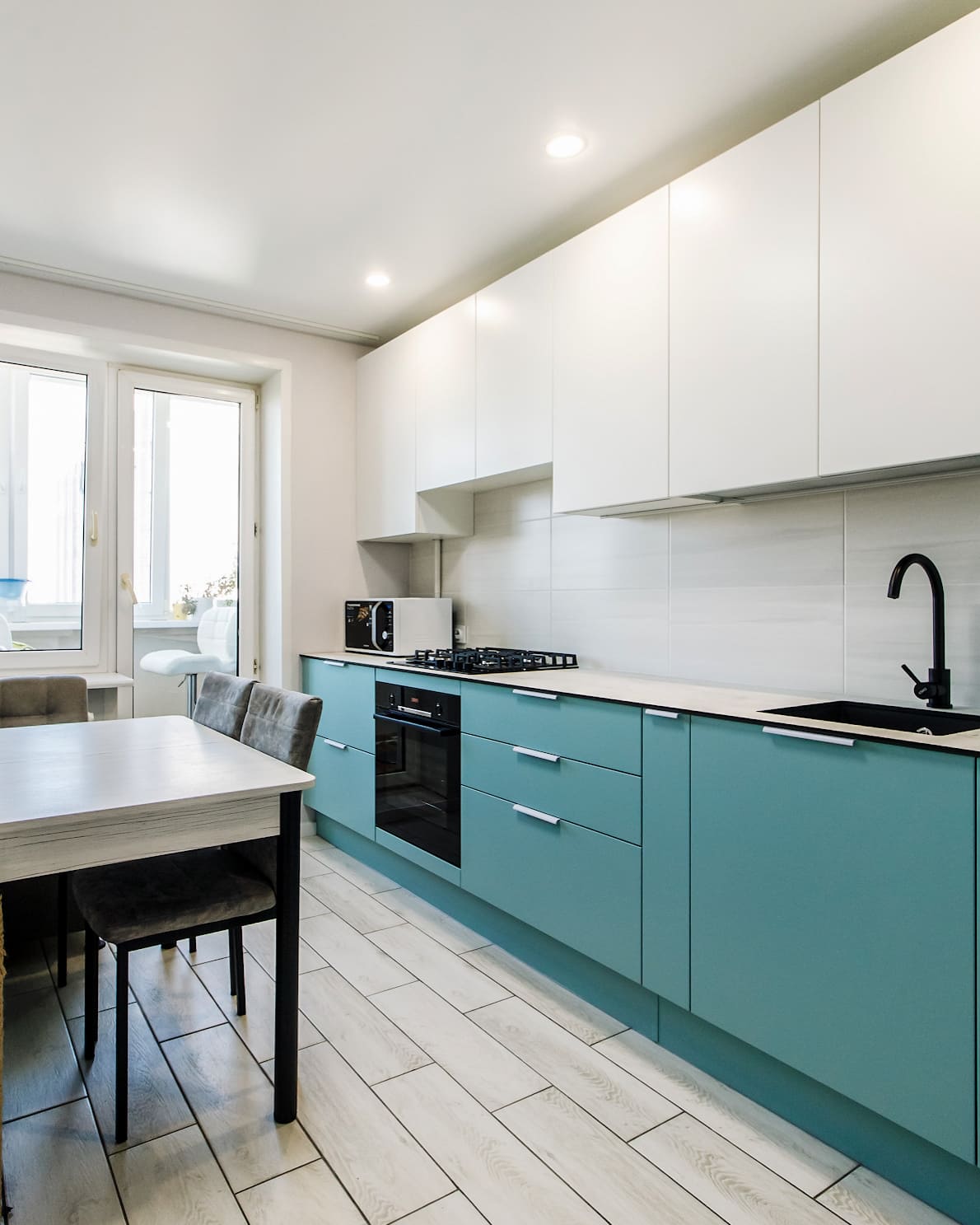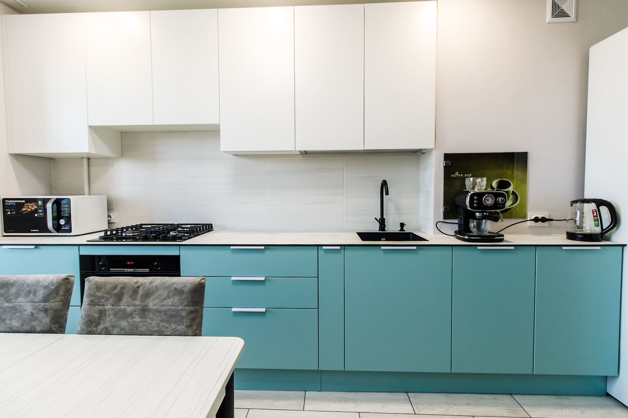 - Цоколь выкрашен в цвет фасадов, но при этом изготовлен из ПВХ, не боится случайных ударов, устойчив к повреждениям и оснащен силиконовым уплотнителем предотвращающим затекание разлитых жидкостей под кухню