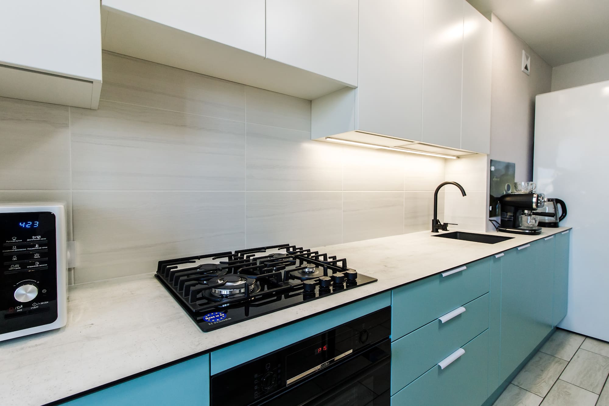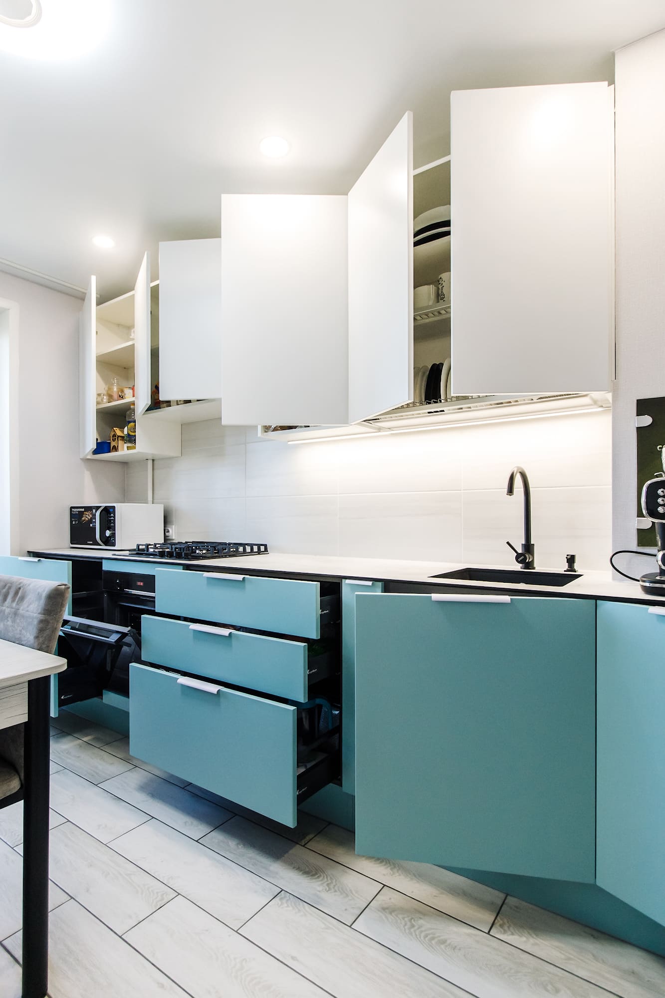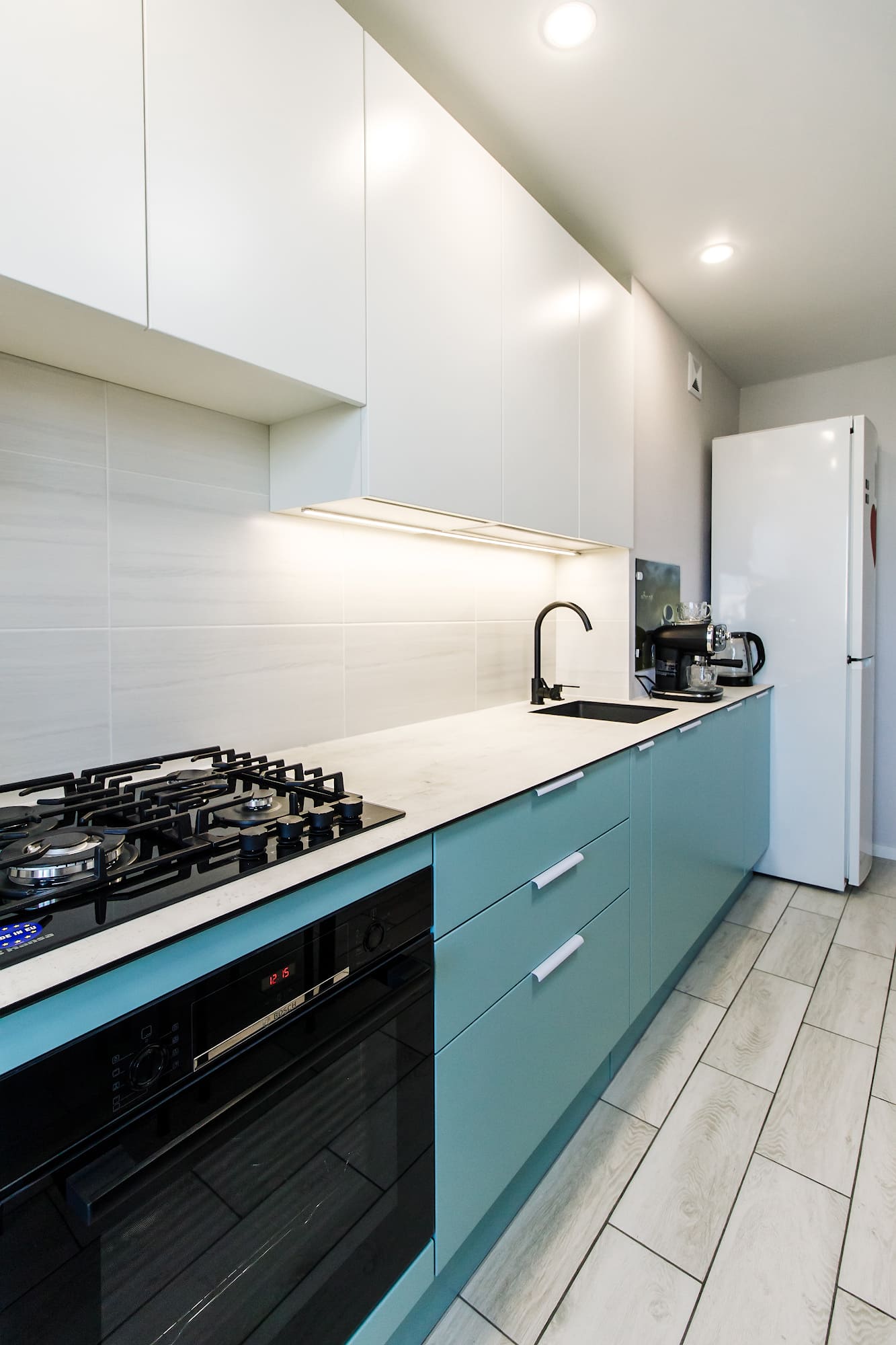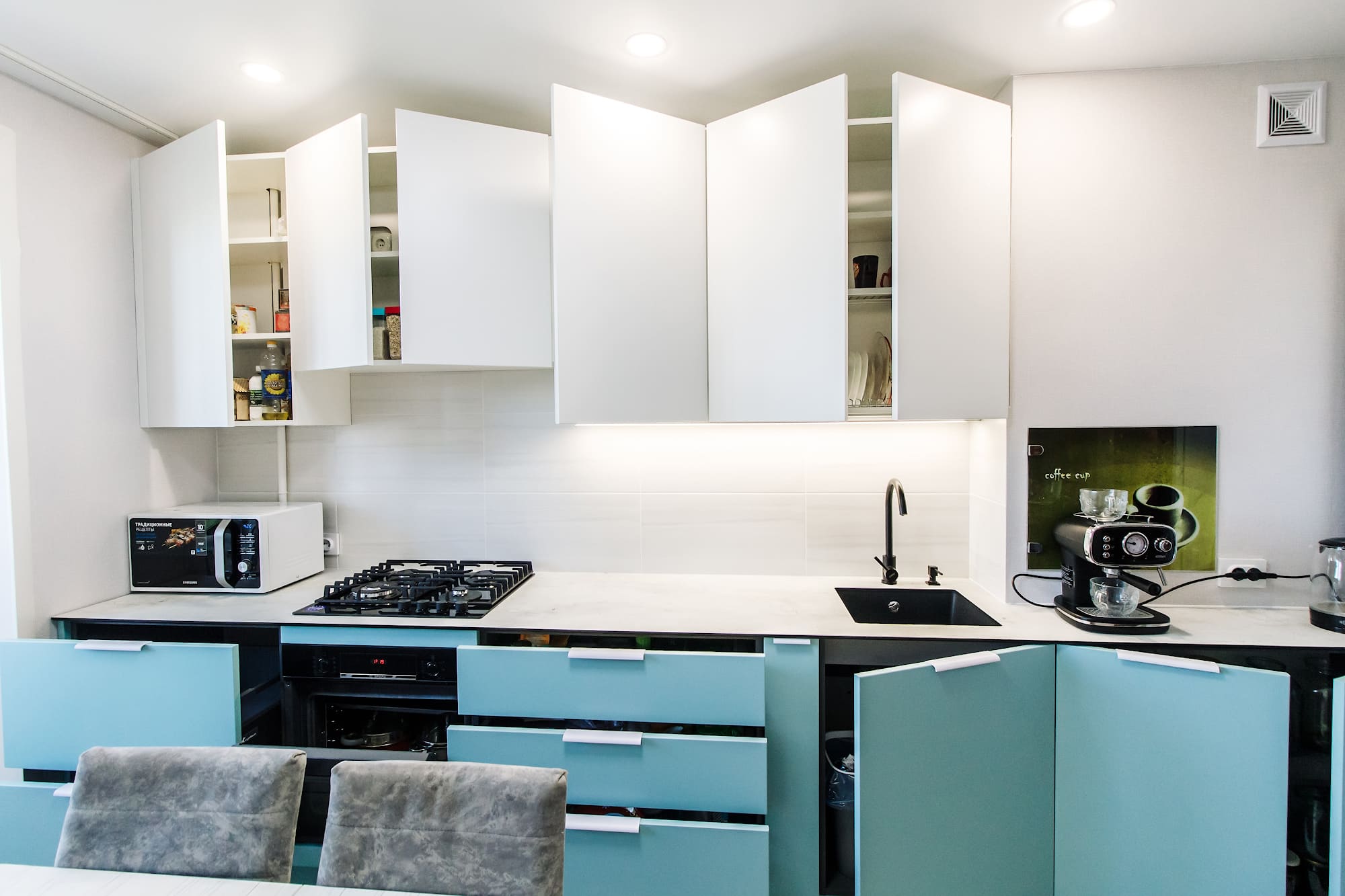 - Цоколь выкрашен в цвет фасадов, но при этом изготовлен из ПВХ, не боится случайных ударов, устойчив к повреждениям и оснащен силиконовым уплотнителем предотвращающим затекание разлитых жидкостей под кухню