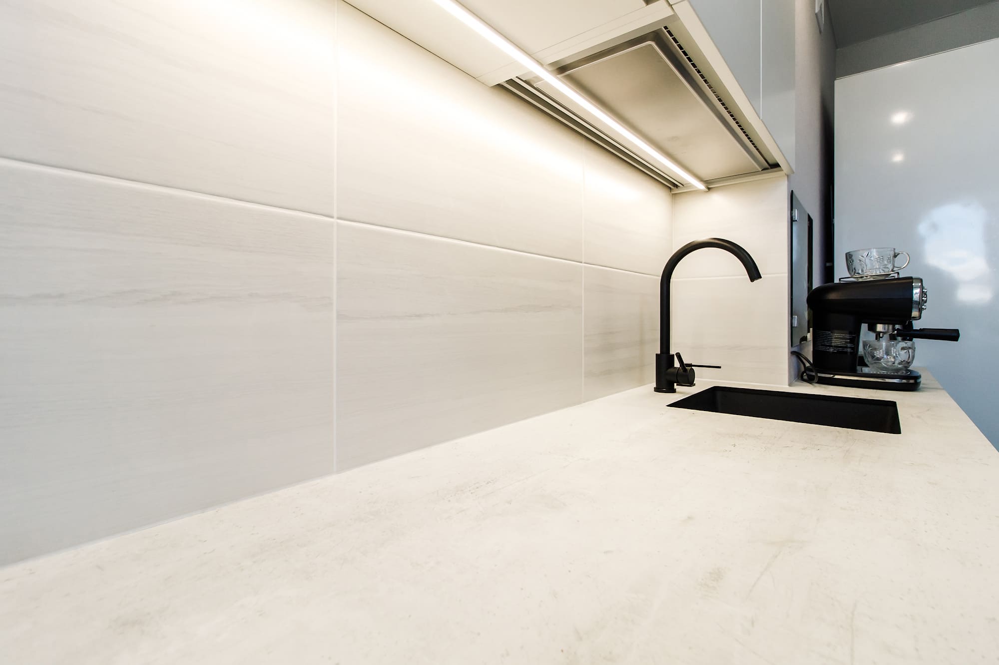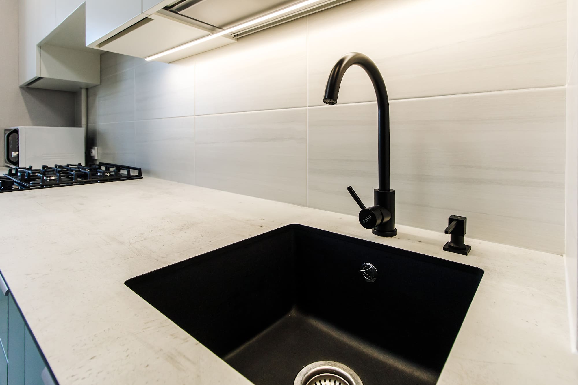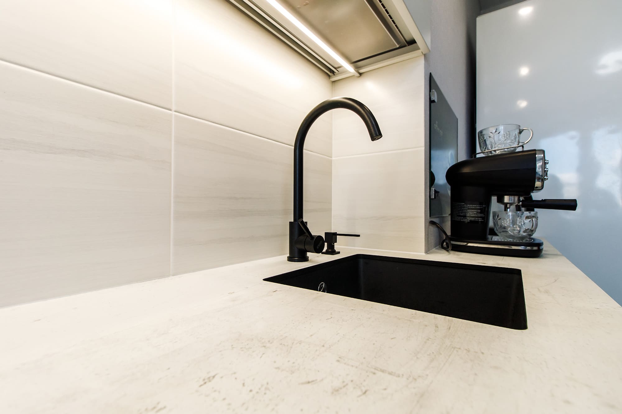 - Столешница из компакт-плиты - это пожалуй самое оптимальное решение с точки зрения надежности и эстетичности. В отличие от постформинга, компакт-плита позволяет устанавливать мойки с под стольным монтажом, имеют толщину всего 12-13мм, и при этом совершенно не боятся влаги. Такие столешницы можно устанавливать даже на улице!