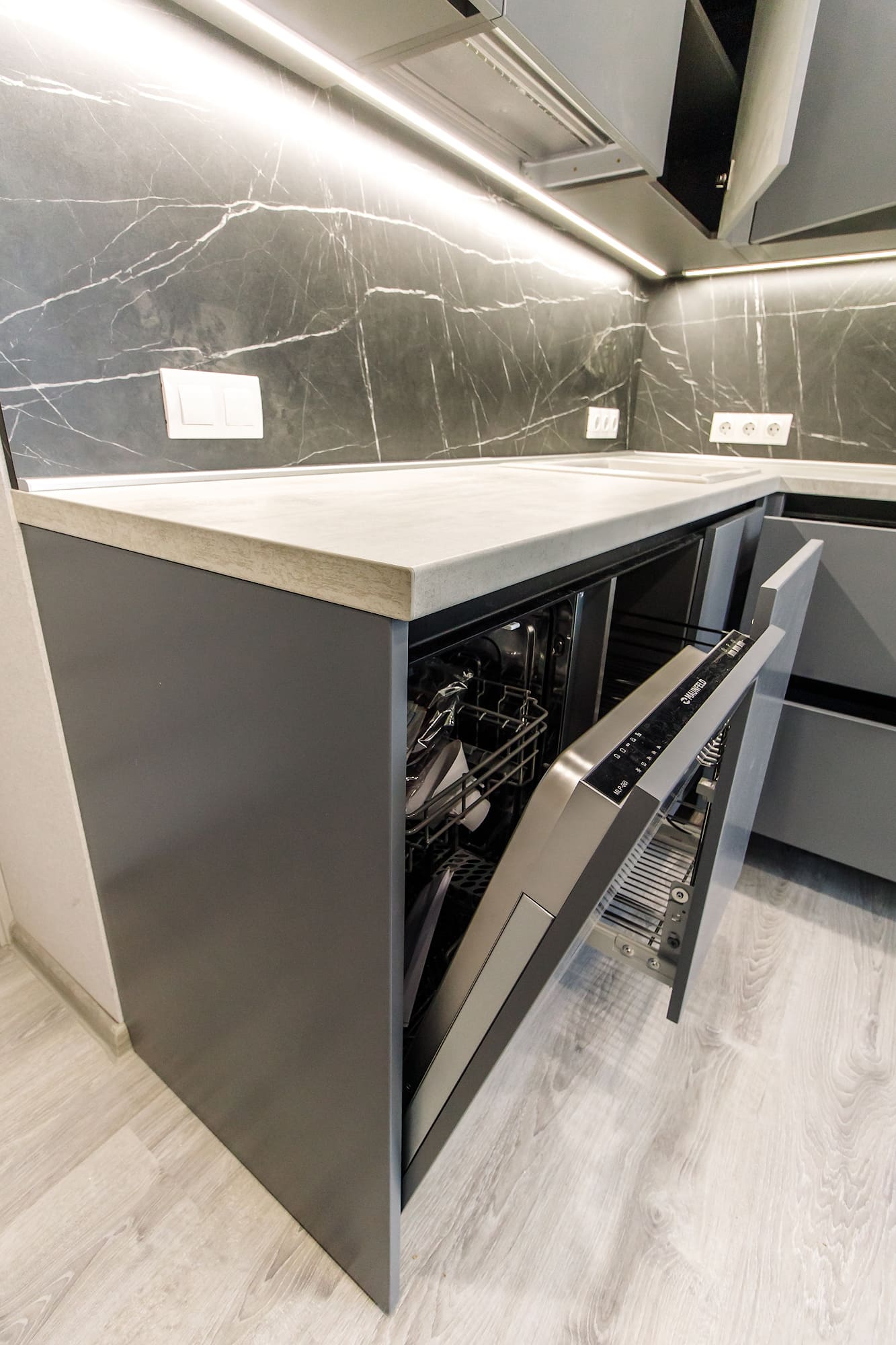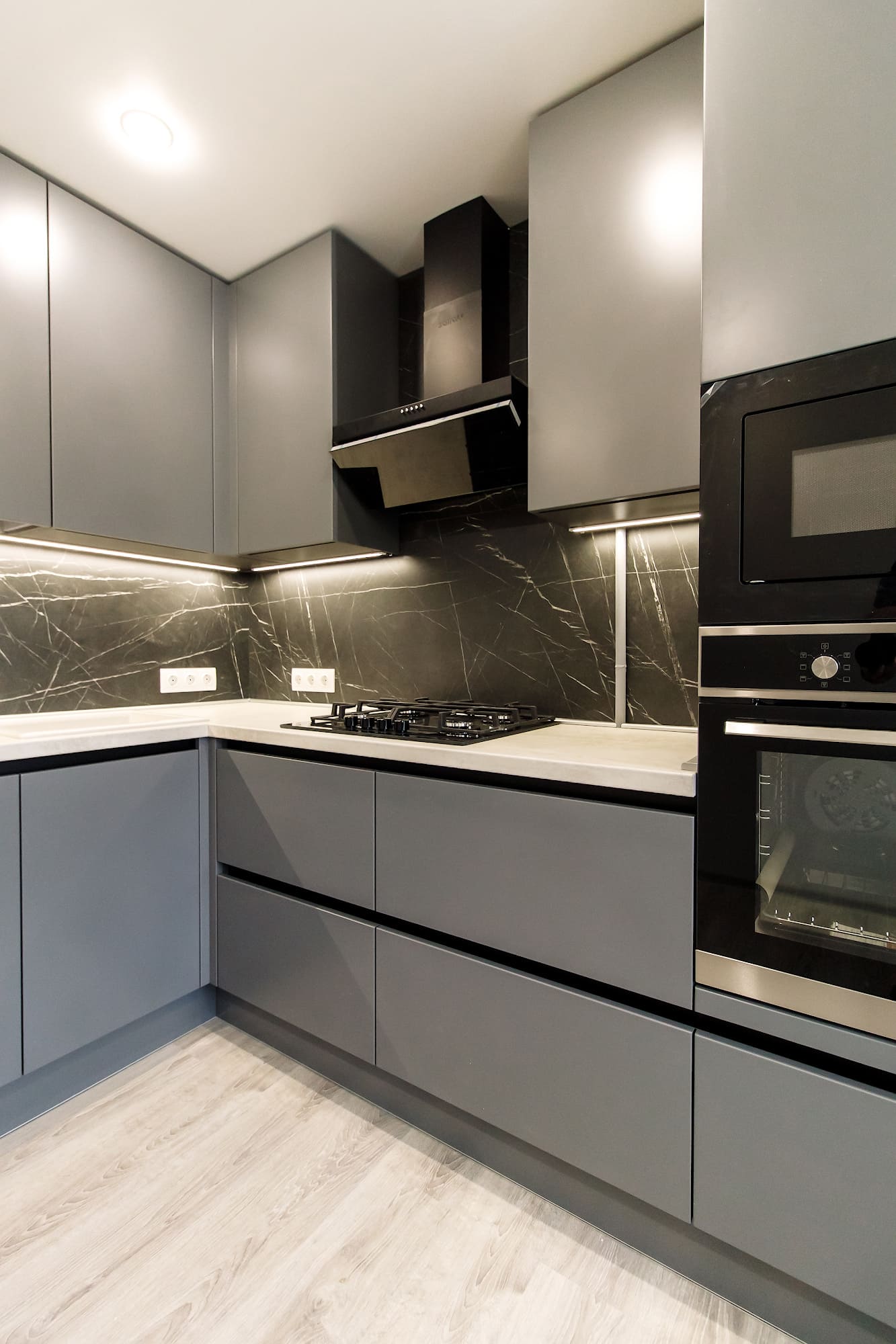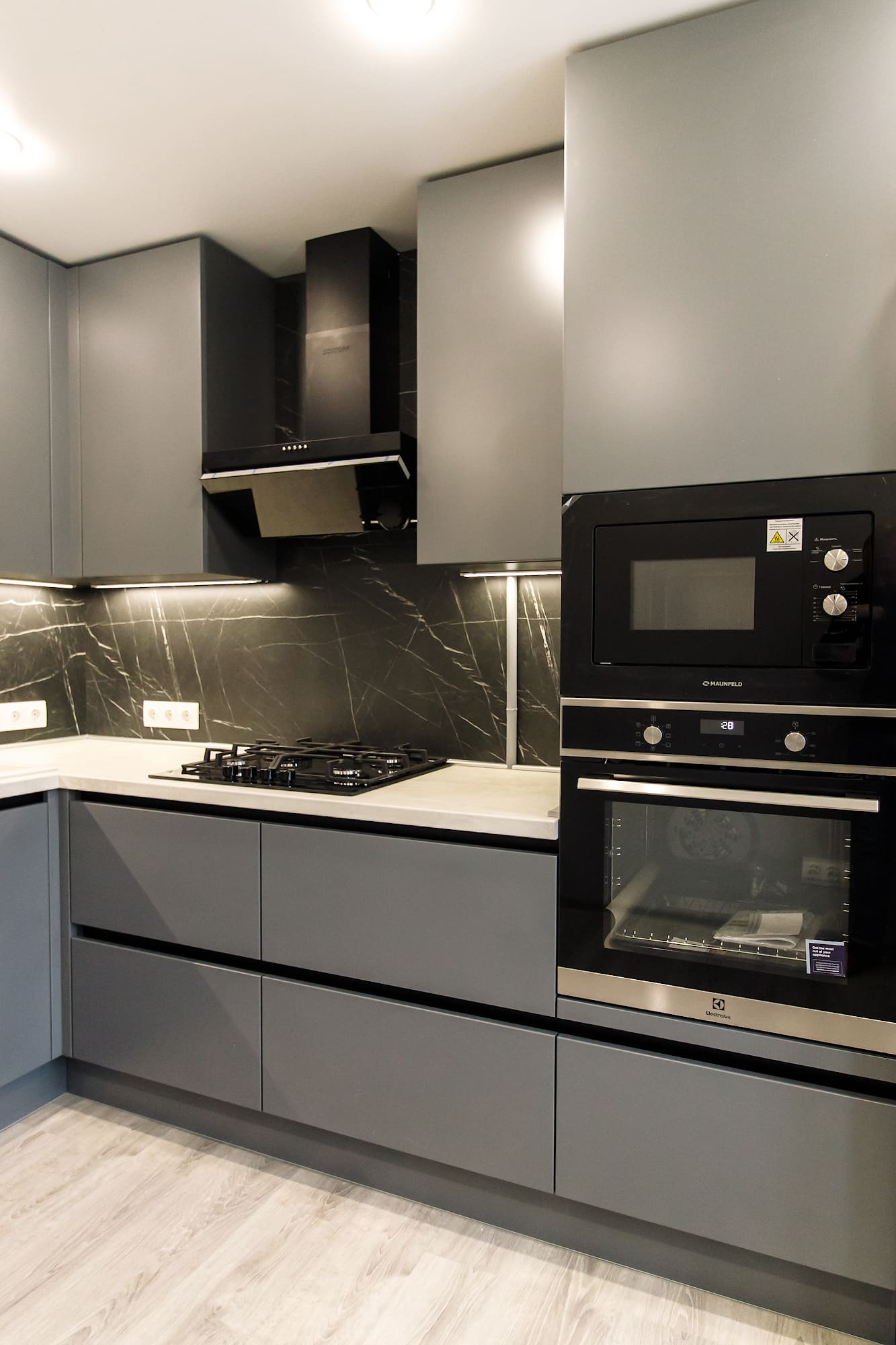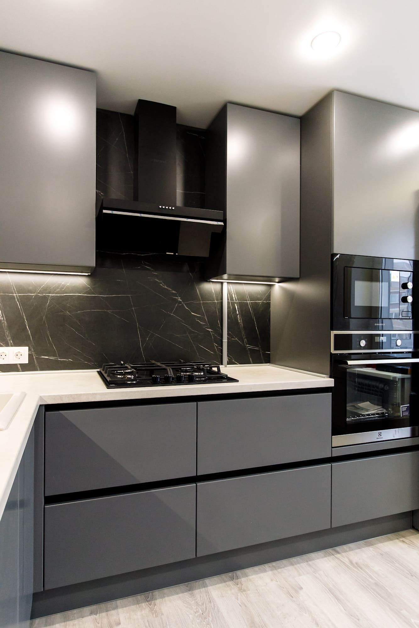 - модель кухни: Rosso, фасада без ручек, открывание за счет зафрезерованного в шкафы, профиля