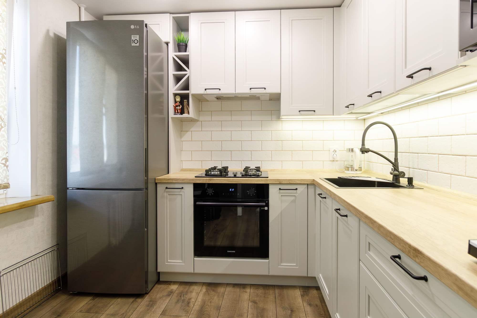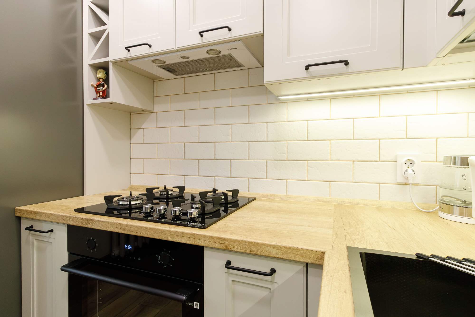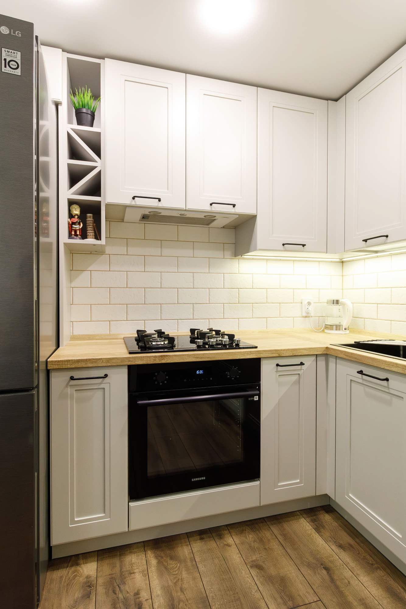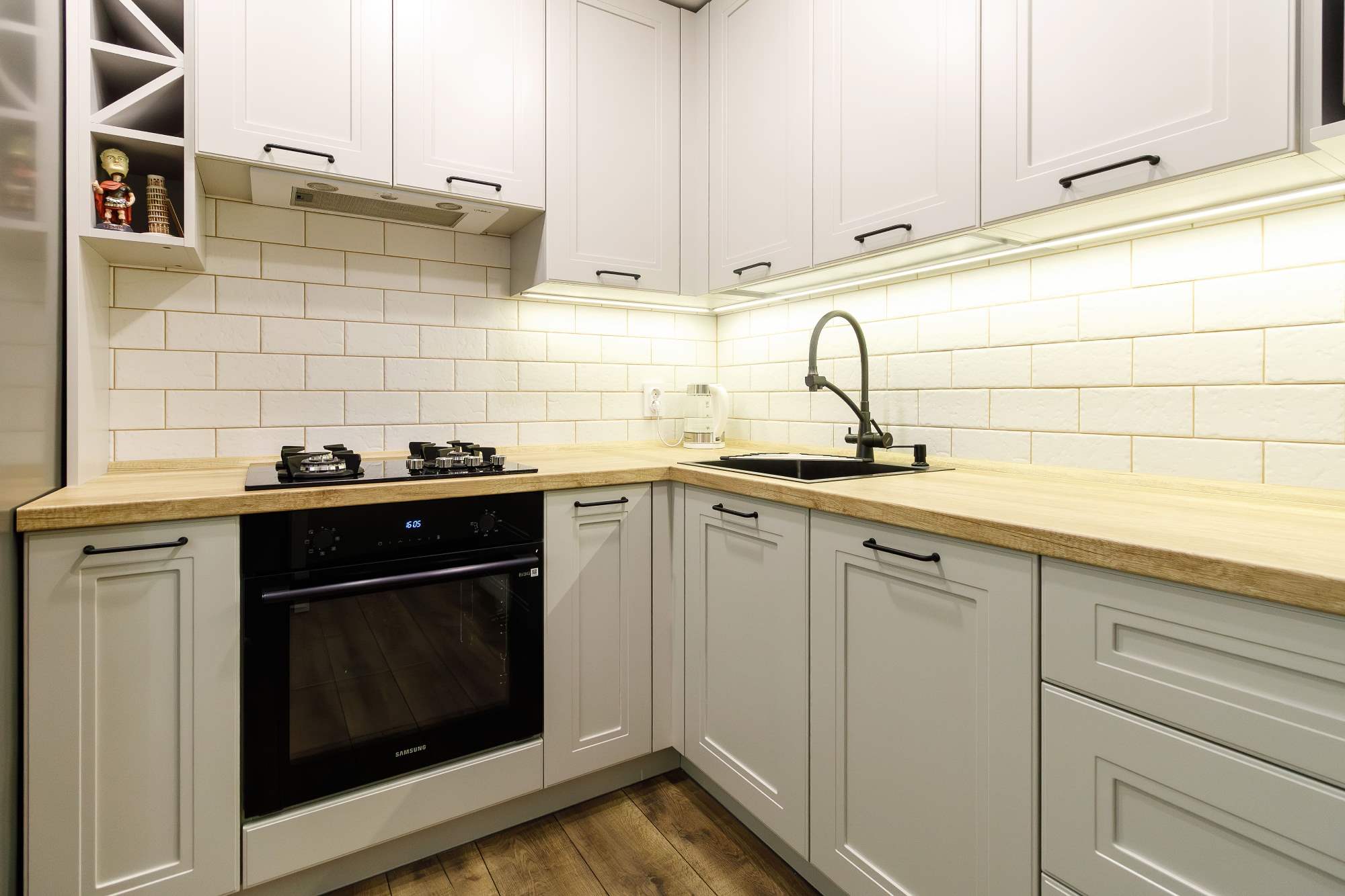 - Светлая столешница с древесным декором.