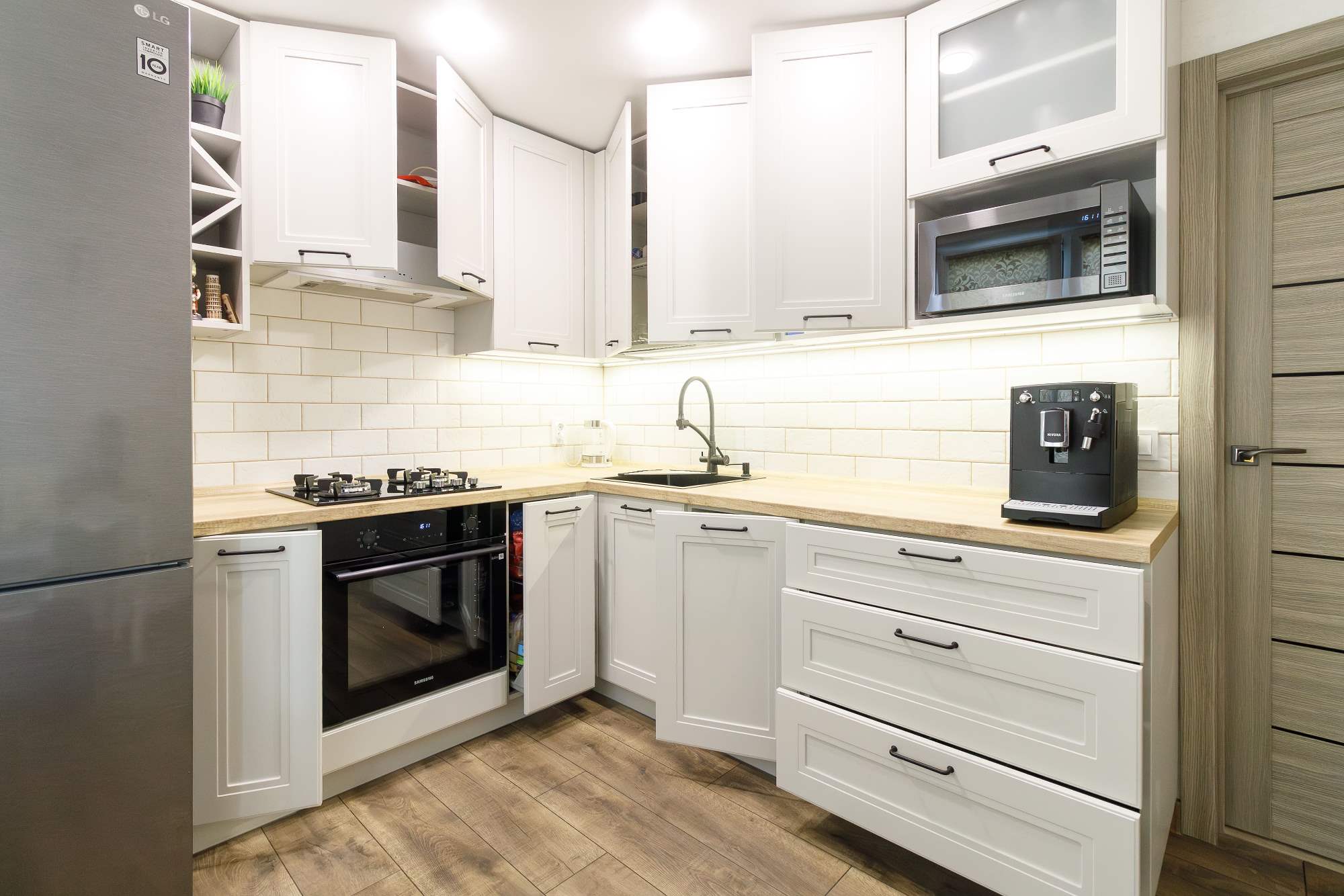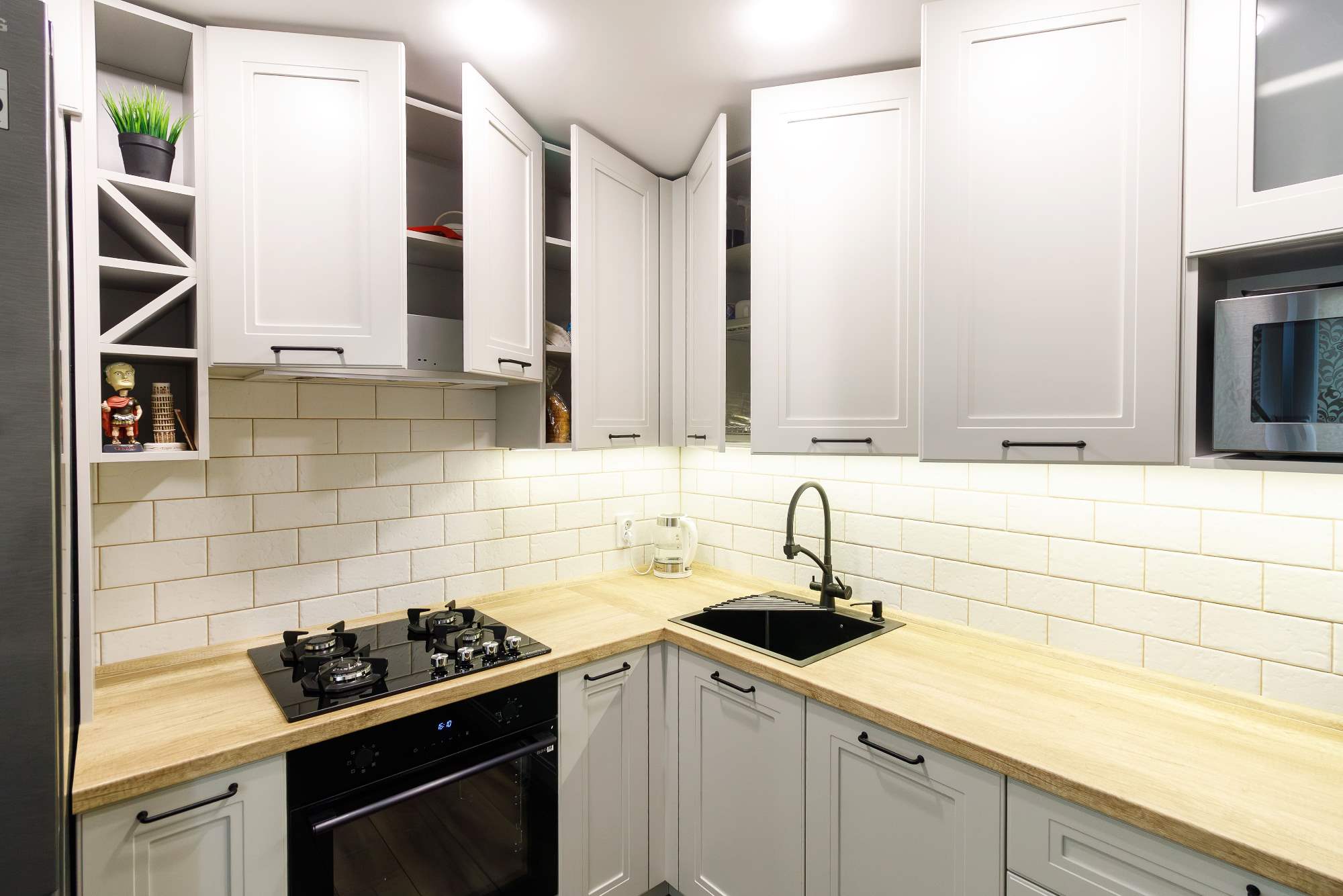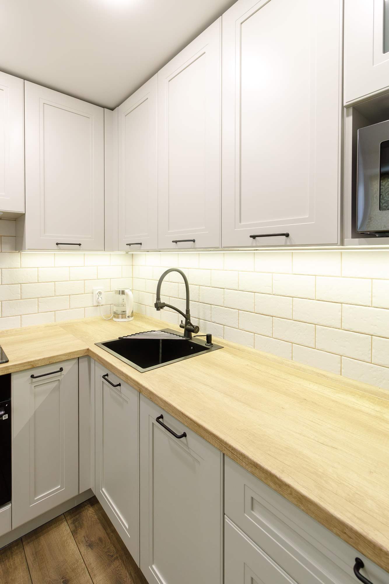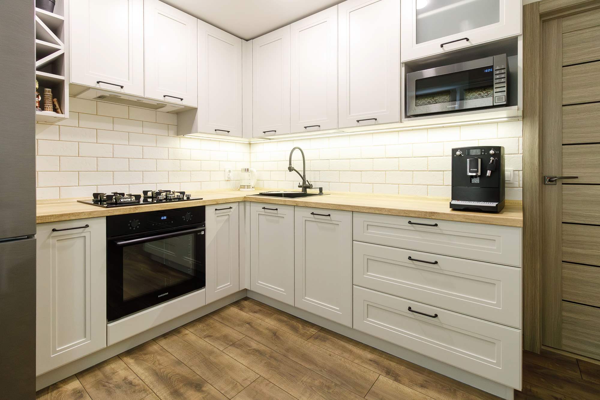 - Светлая столешница с древесным декором.