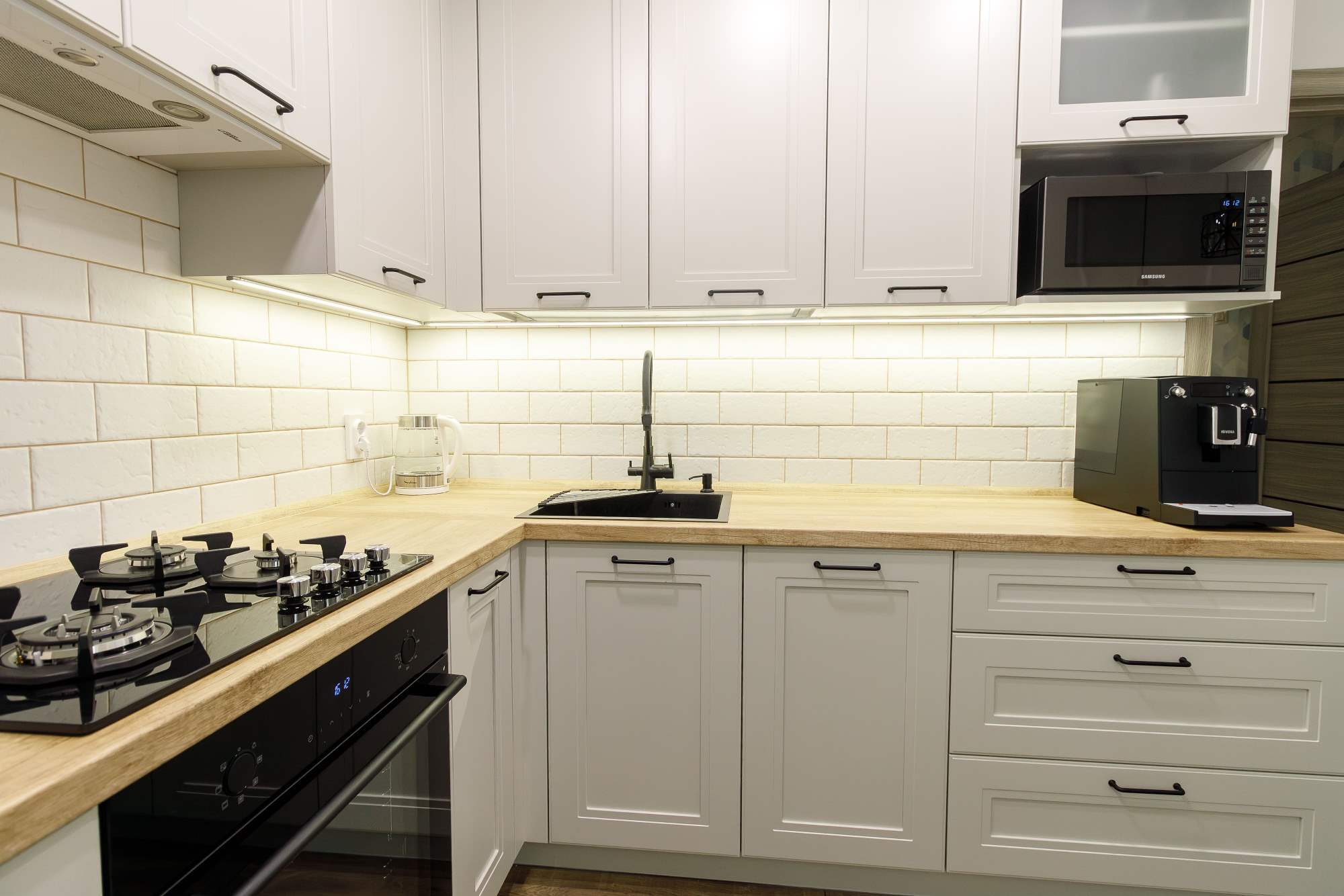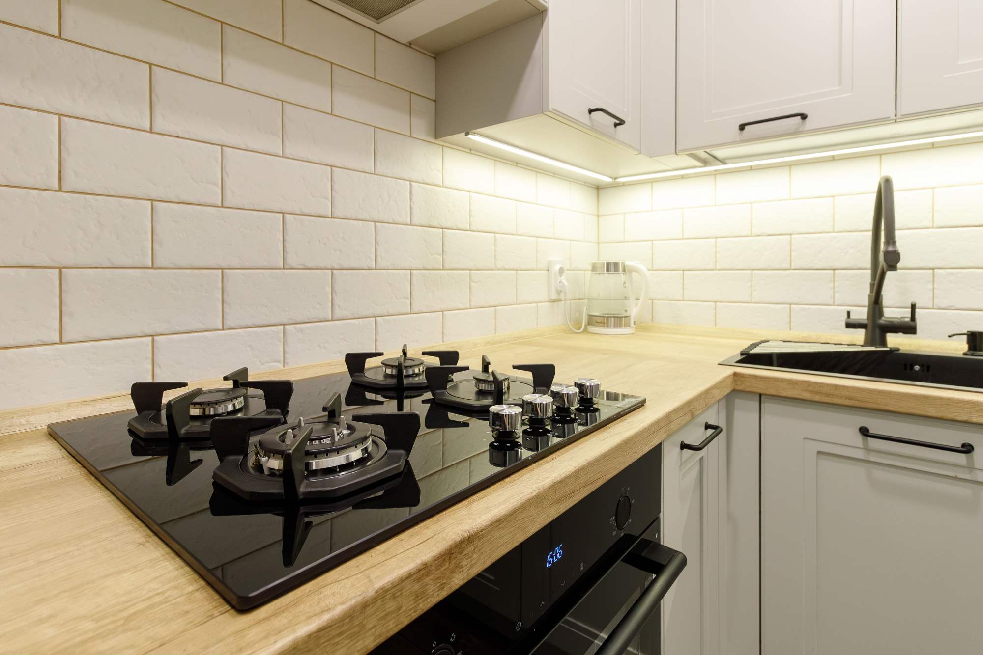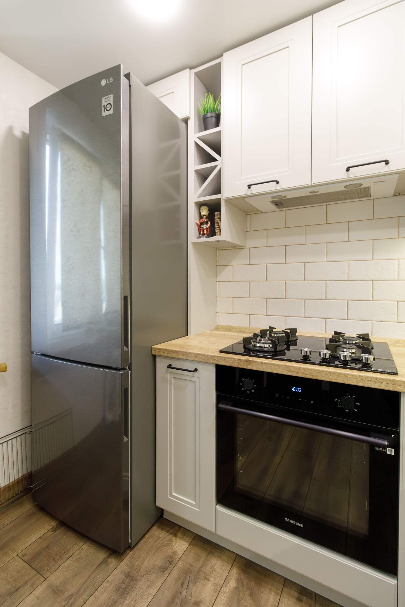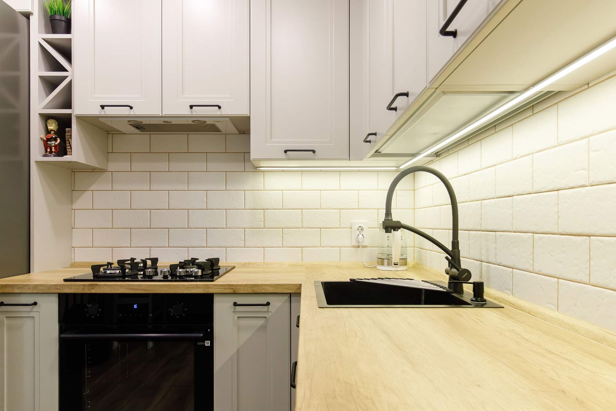 - Светлая столешница с древесным декором.