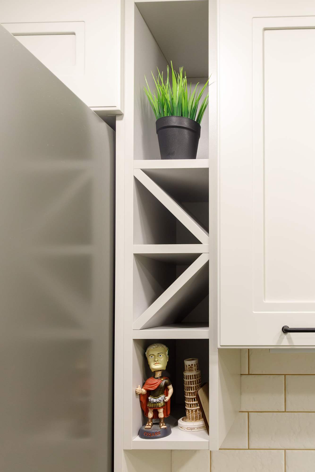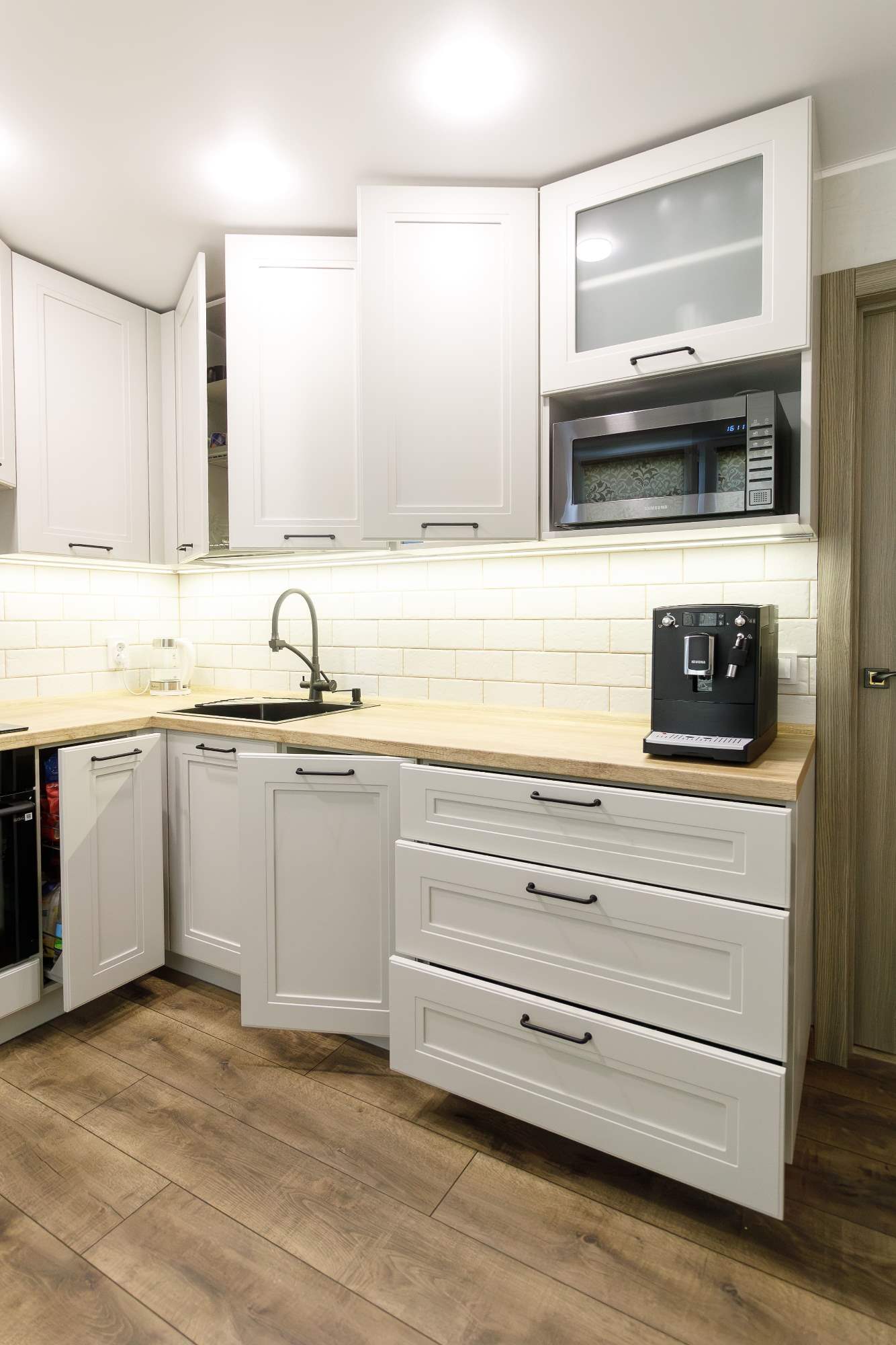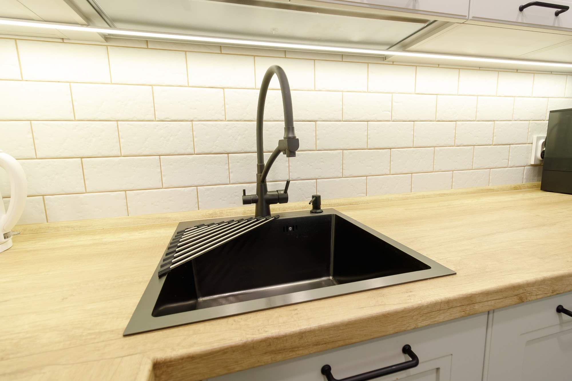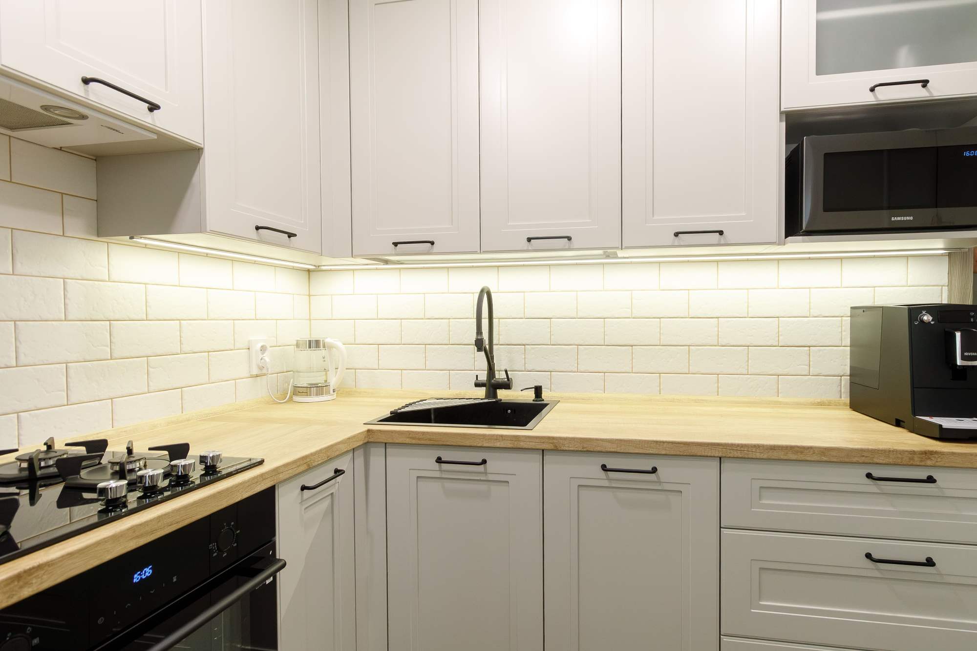 - Светлая столешница с древесным декором.