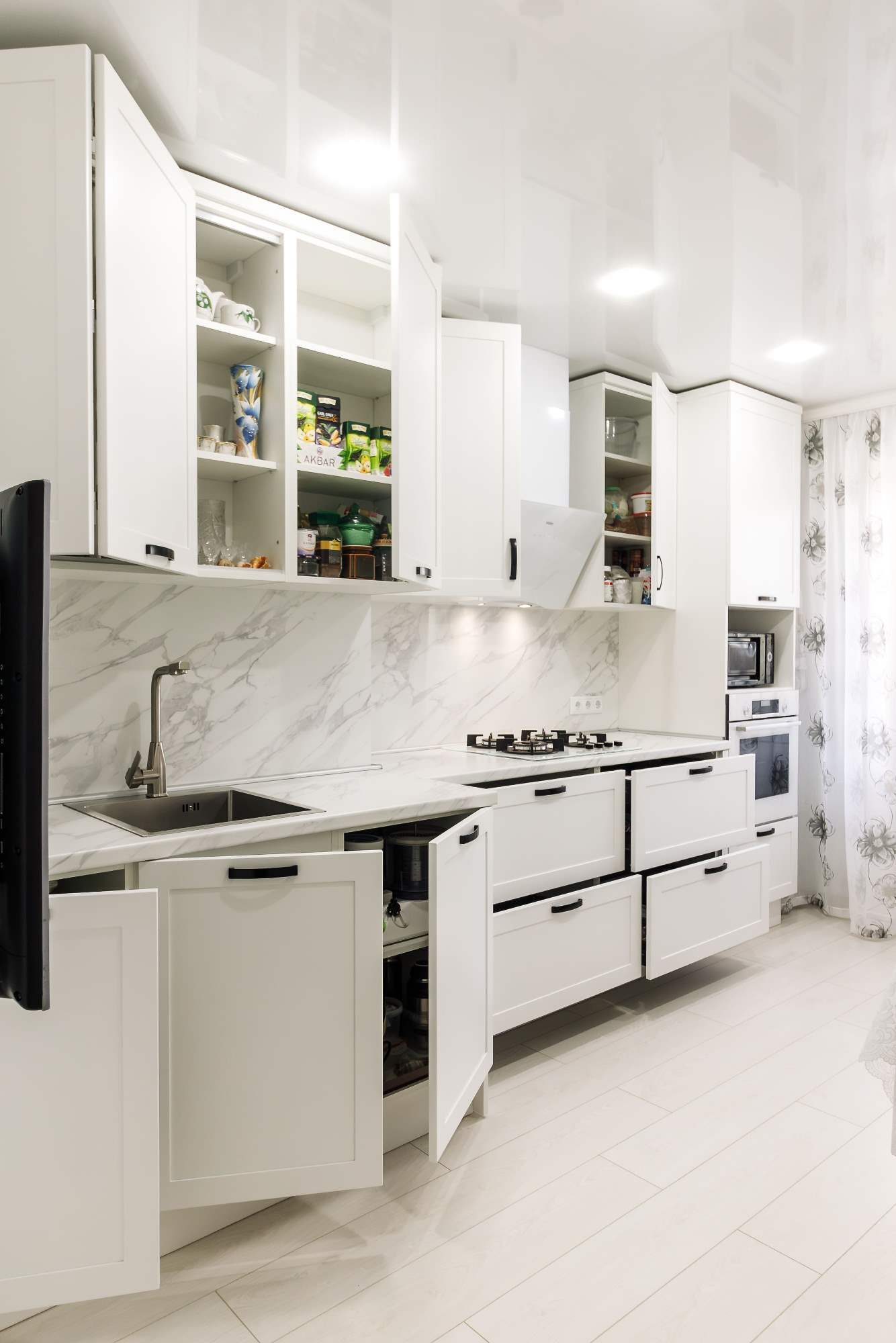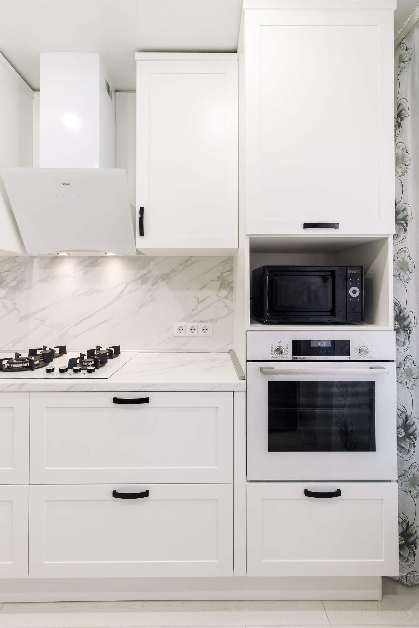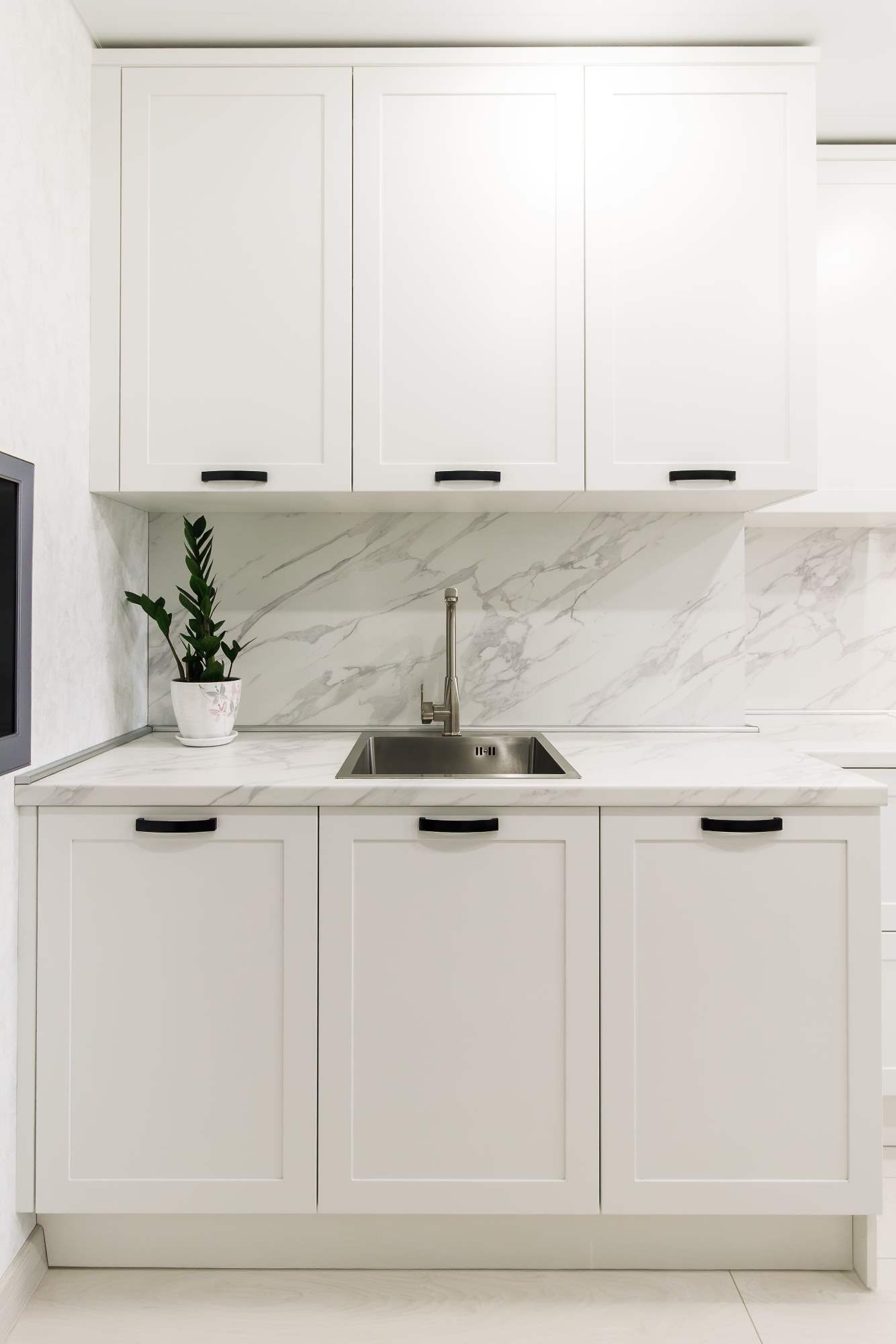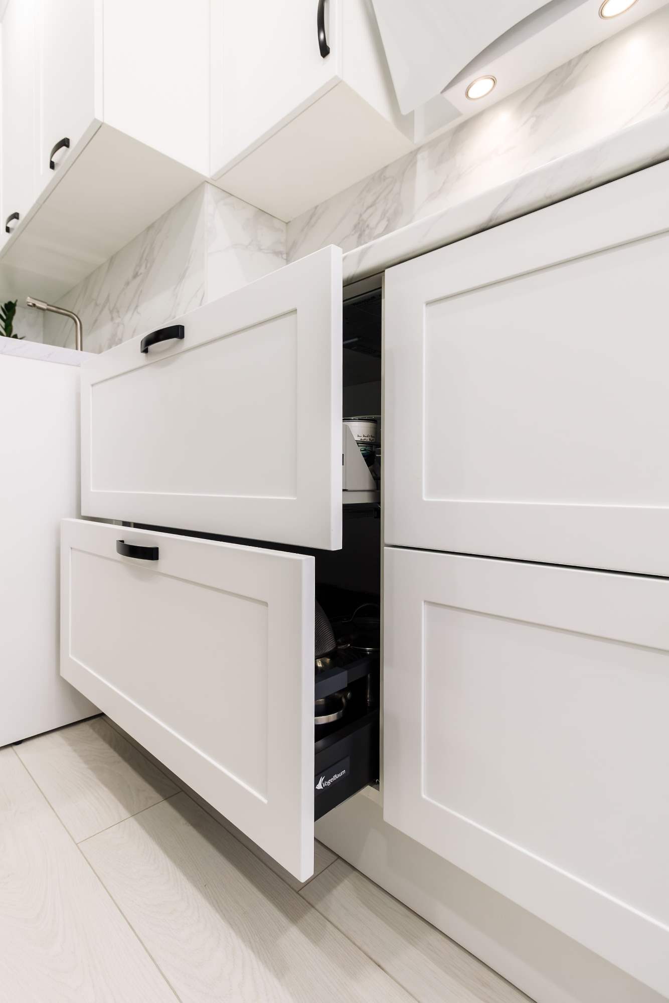 - Нежные крашенные фасады в белом цвете с акцентными черными ручками.