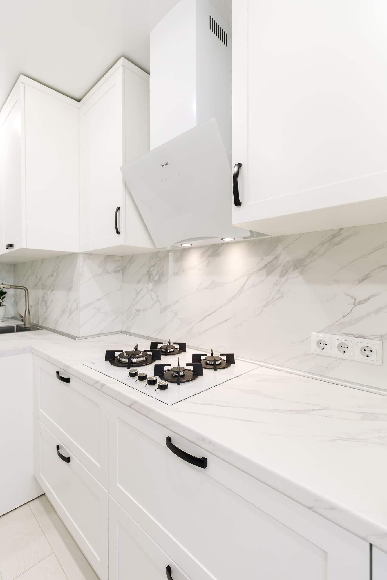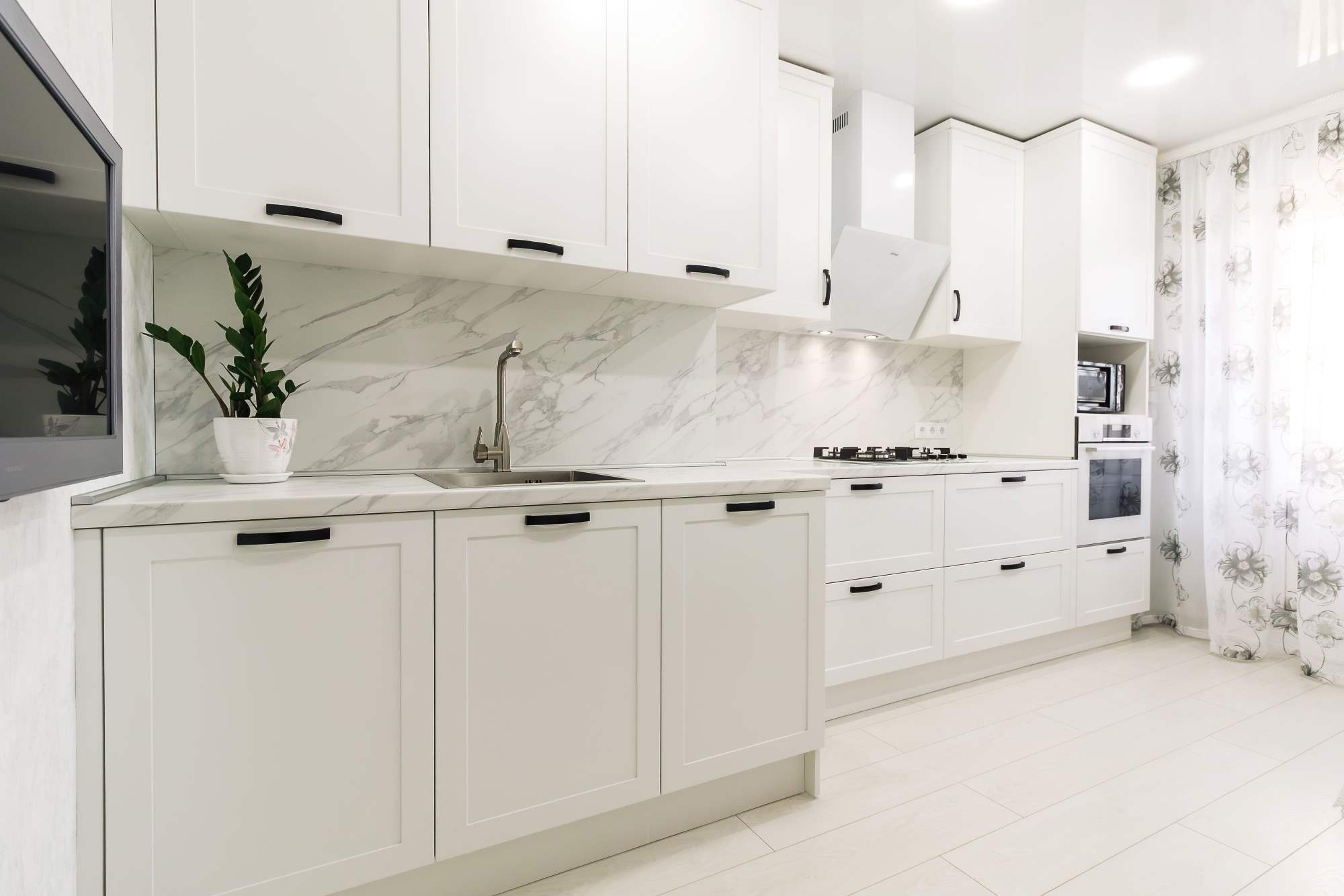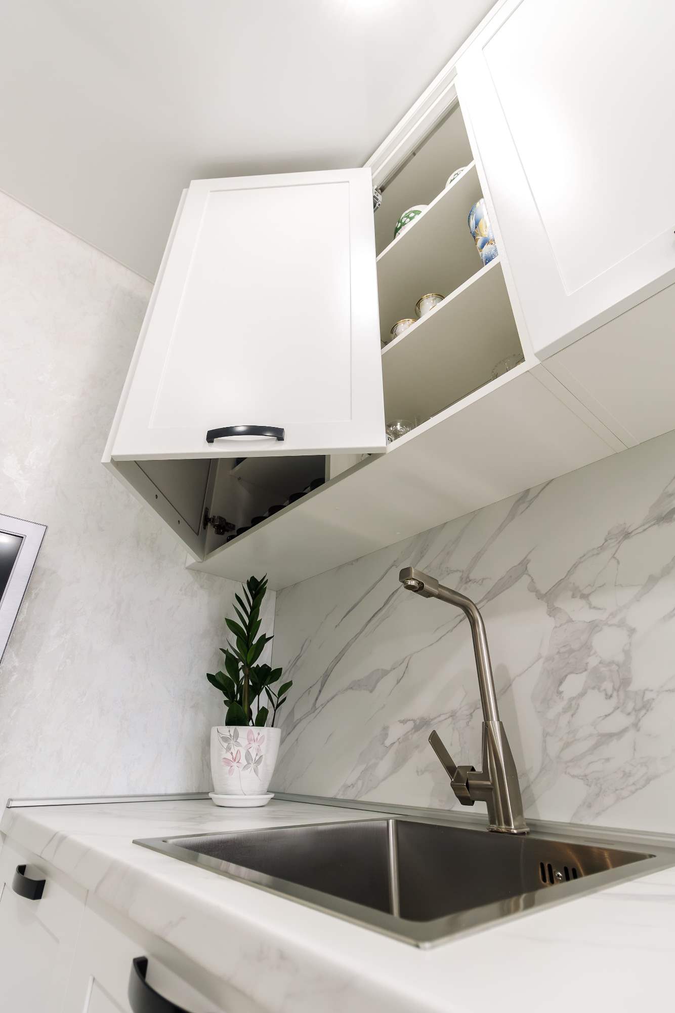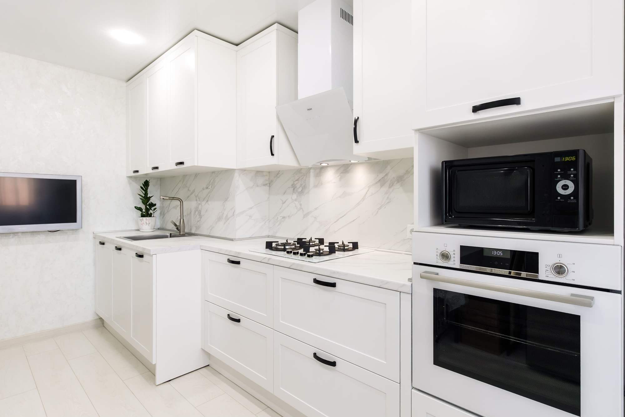 - Нежные крашенные фасады в белом цвете с акцентными черными ручками.
