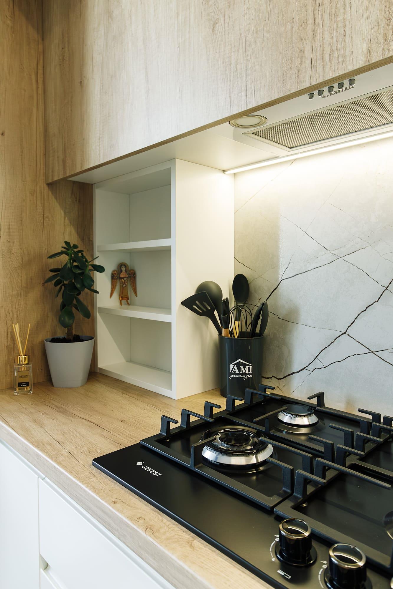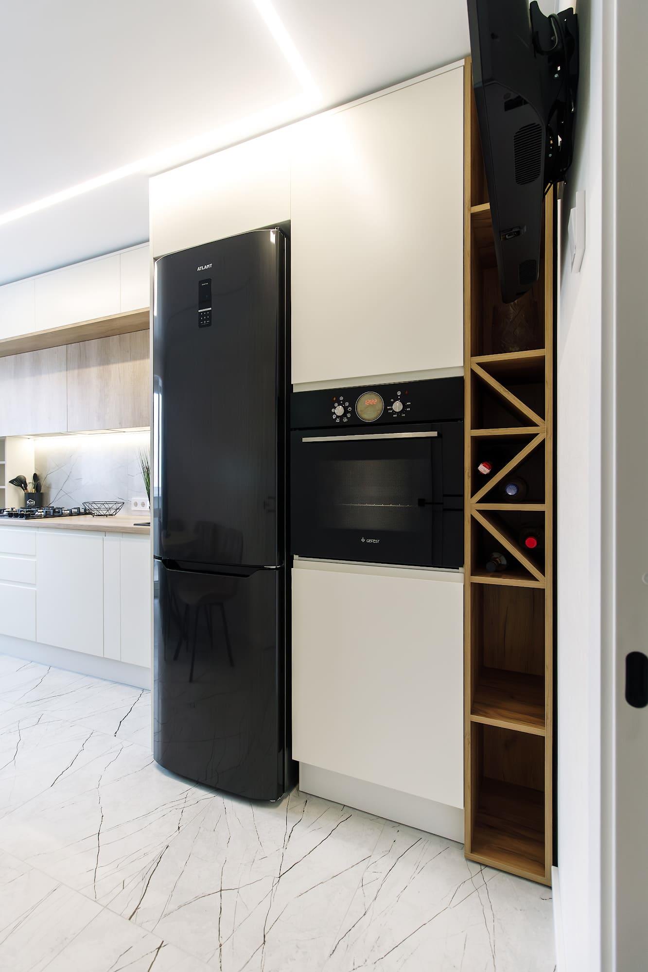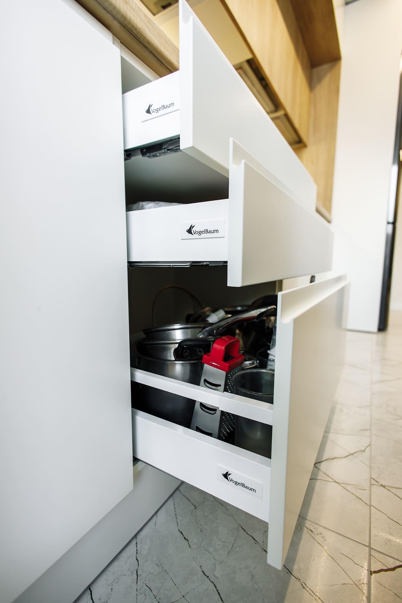 - Фурнитура от лучших производителей подчеркивает высокий статус кухни: ящики Hettich Atira и петли Blum.