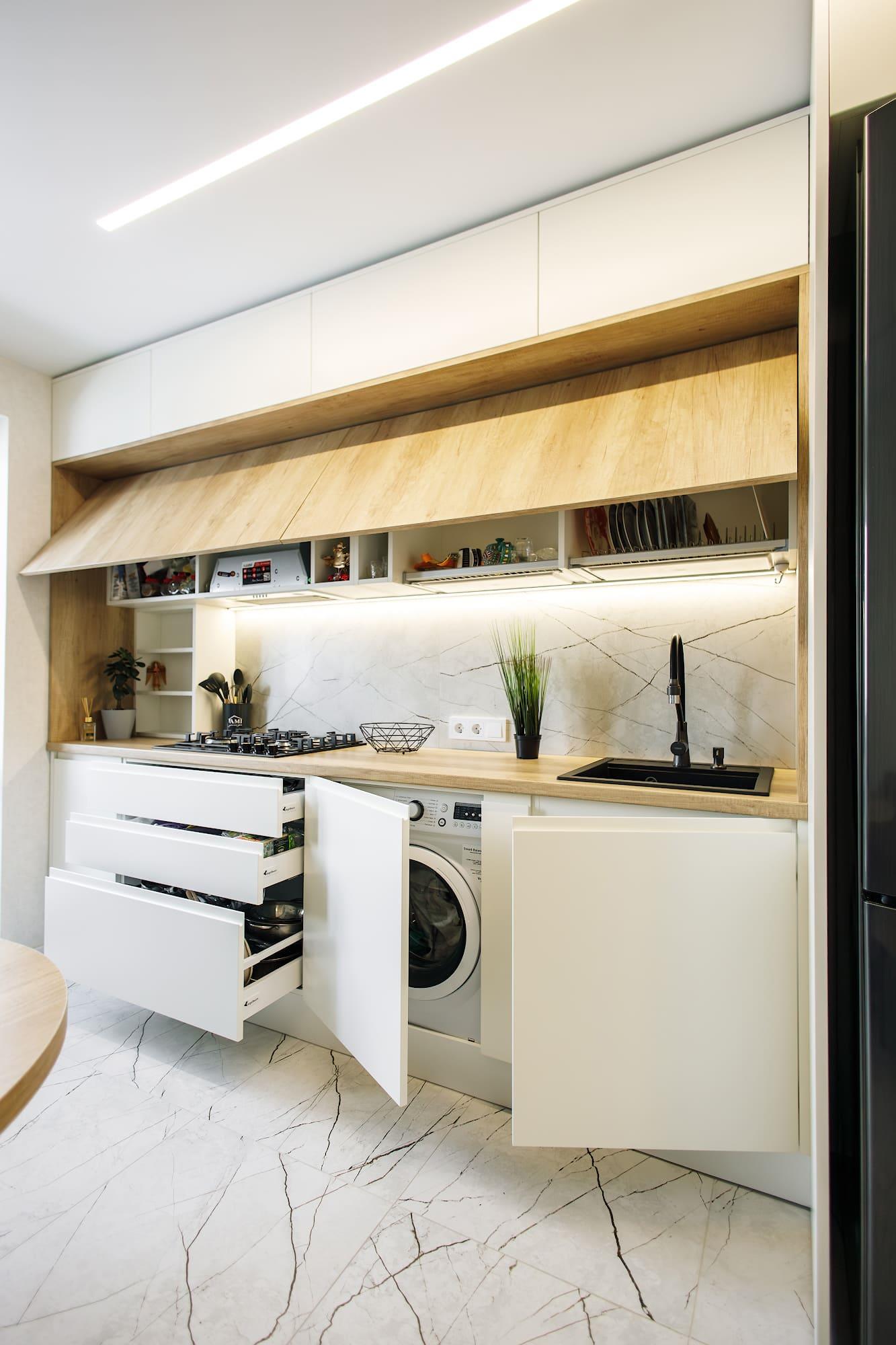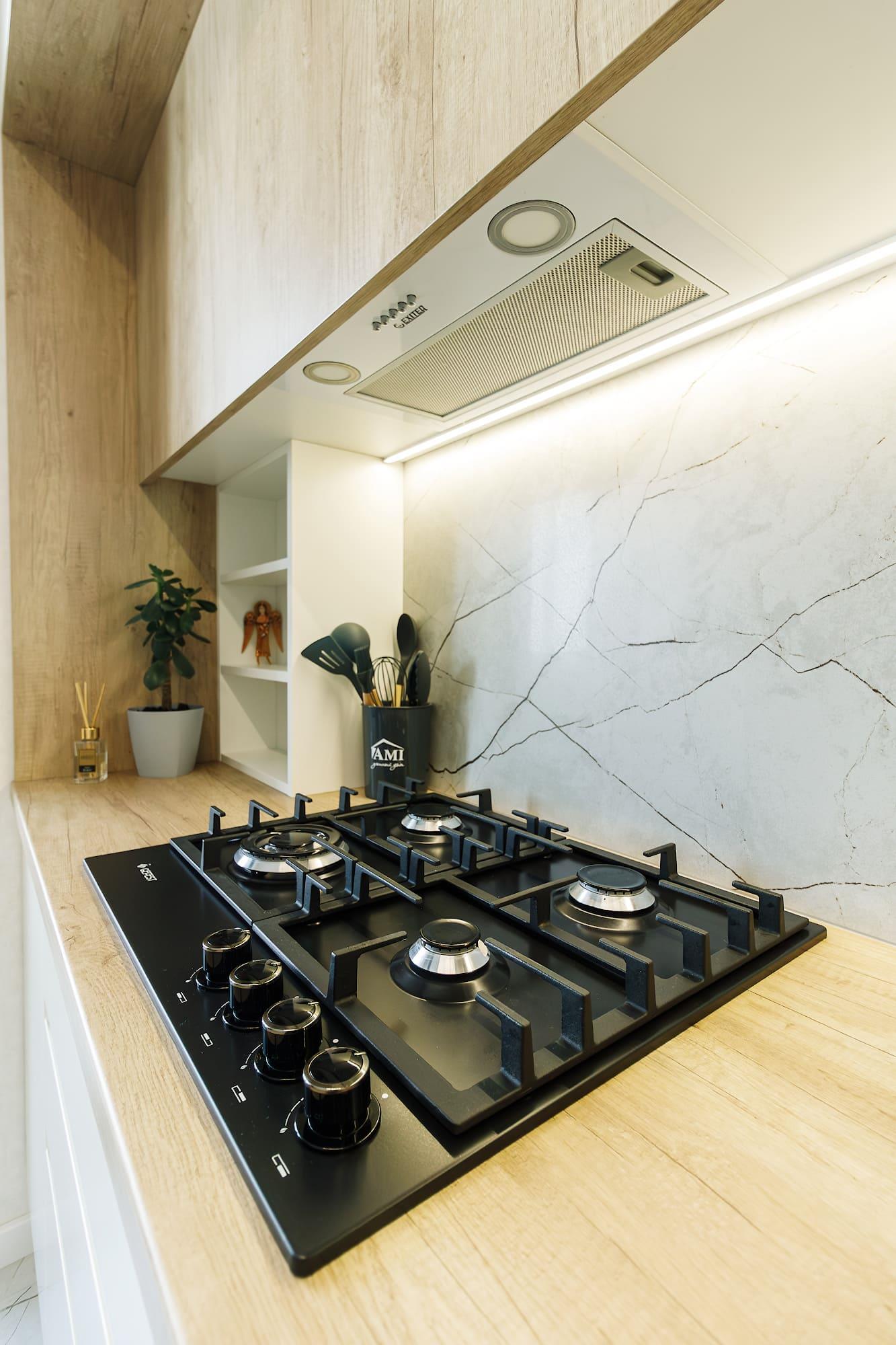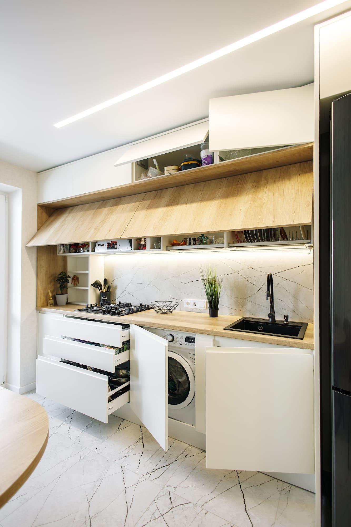 - Фурнитура от лучших производителей подчеркивает высокий статус кухни: ящики Hettich Atira и петли Blum.