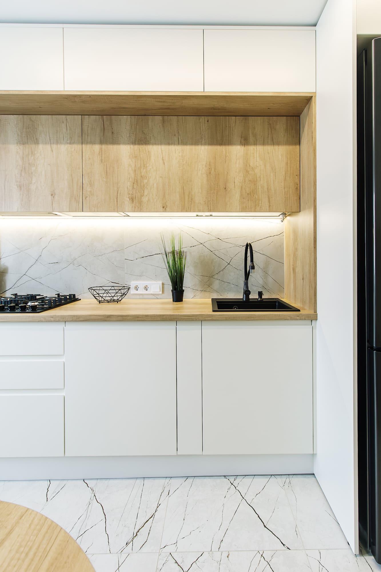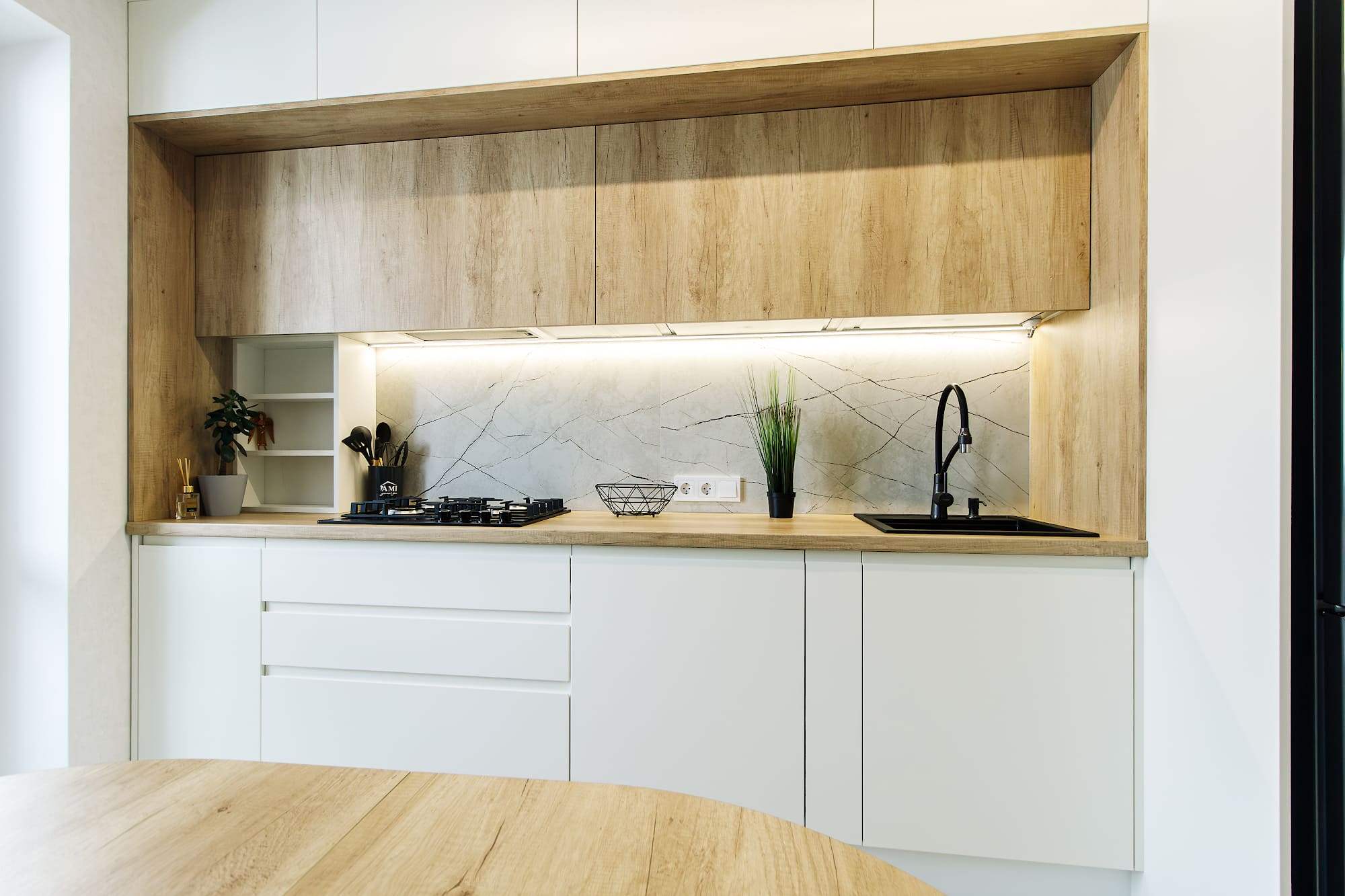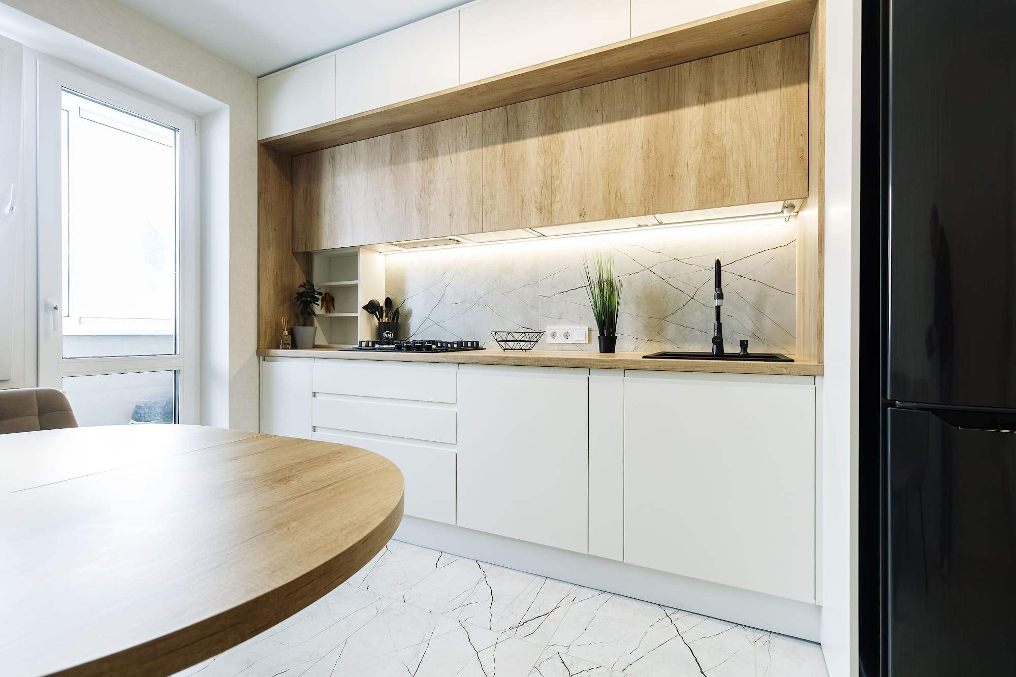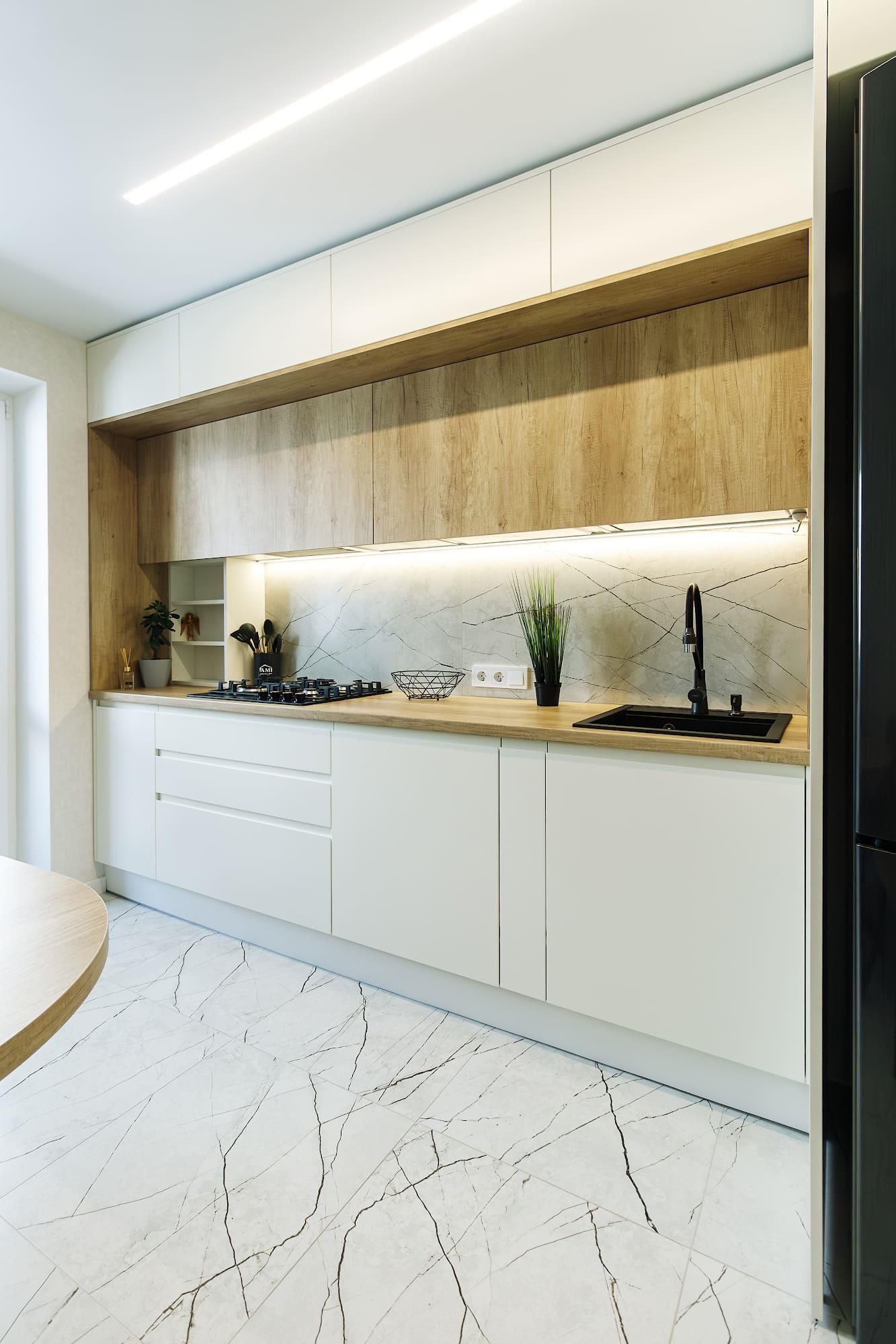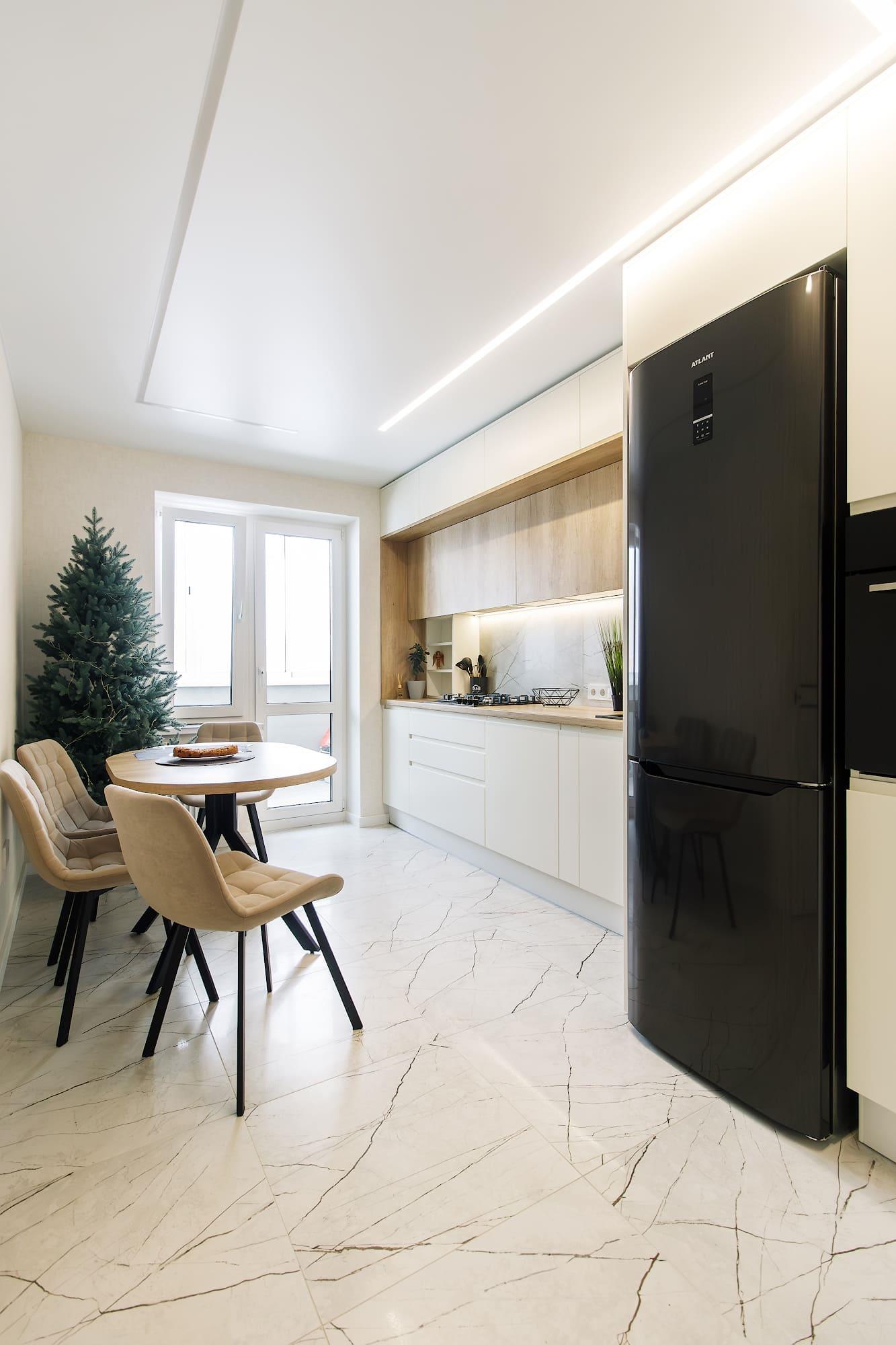 - Визуально расширяет пространство и полезную плошадь выполнение кухни «в потолок».