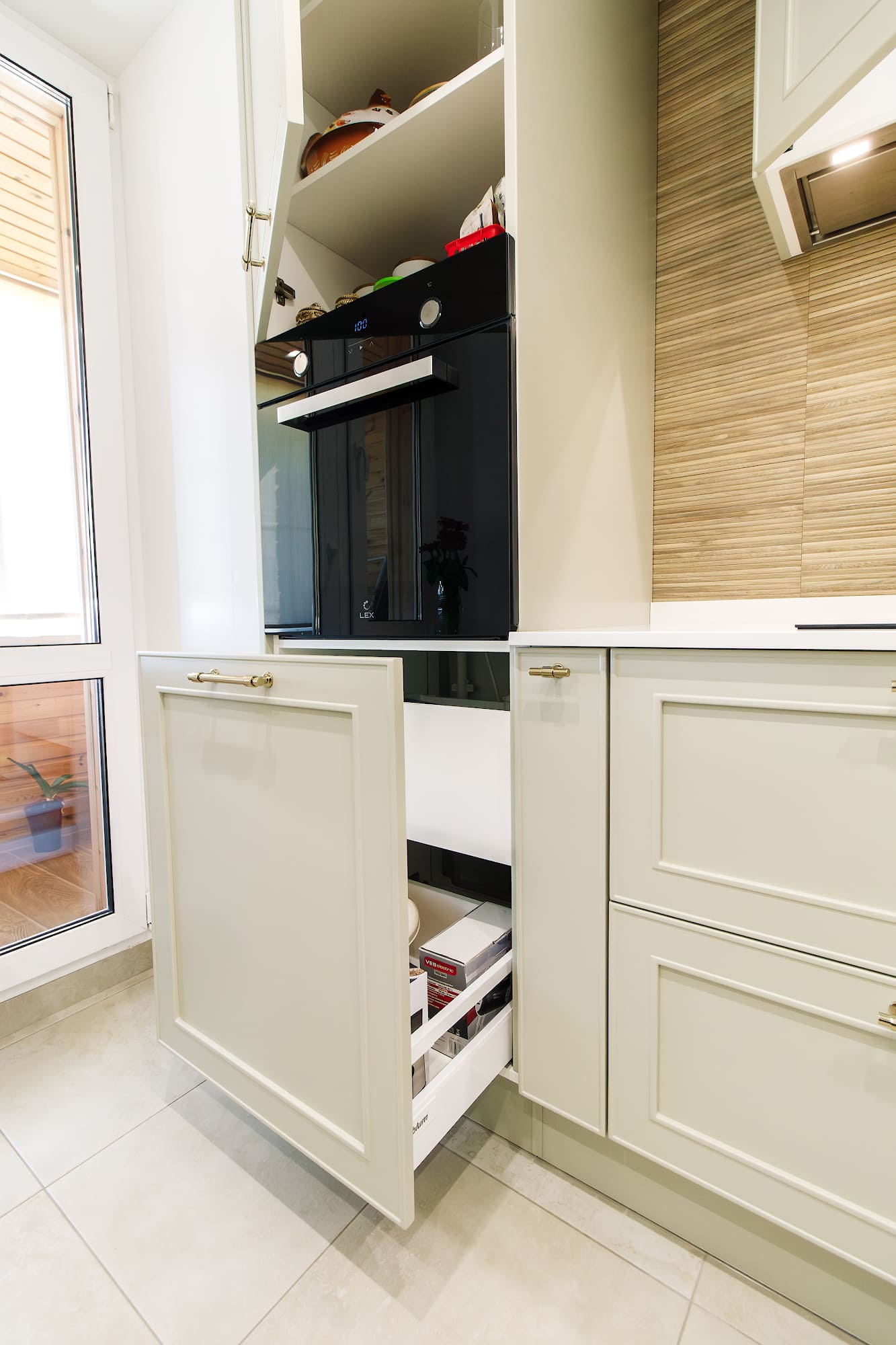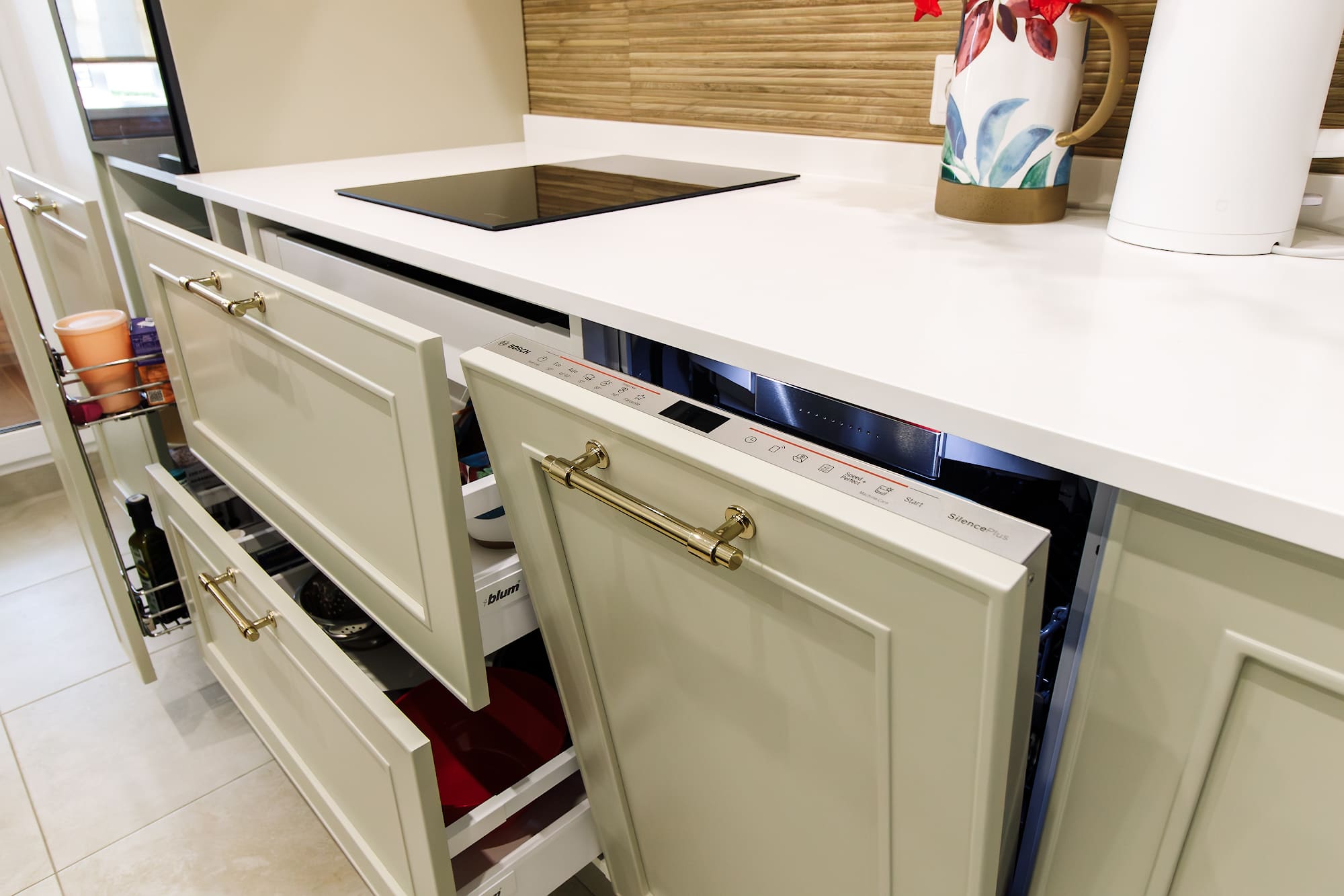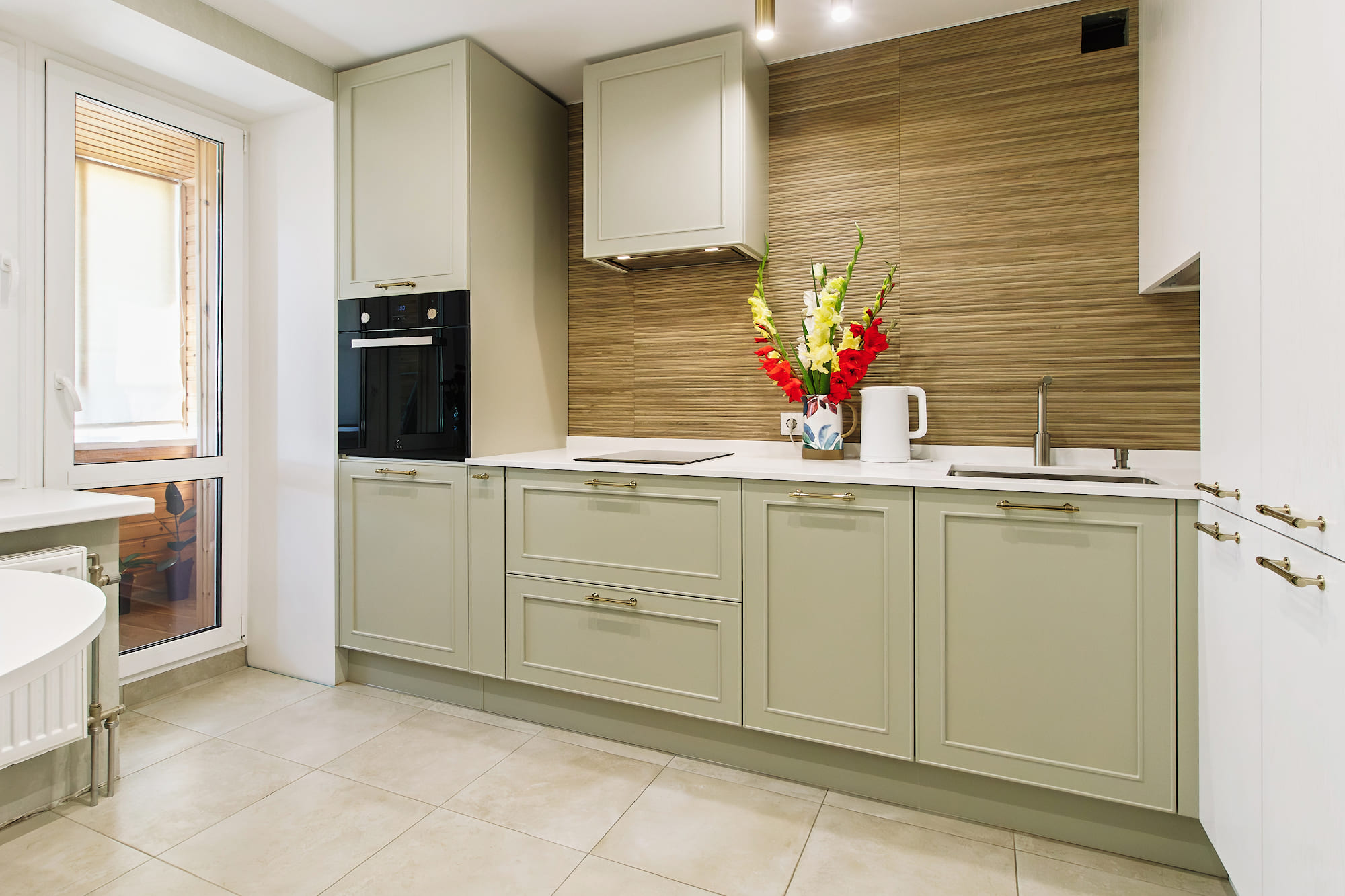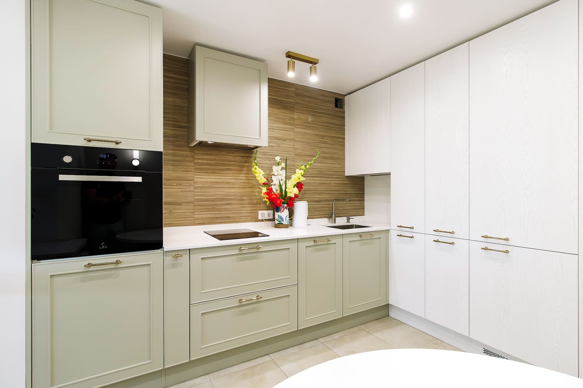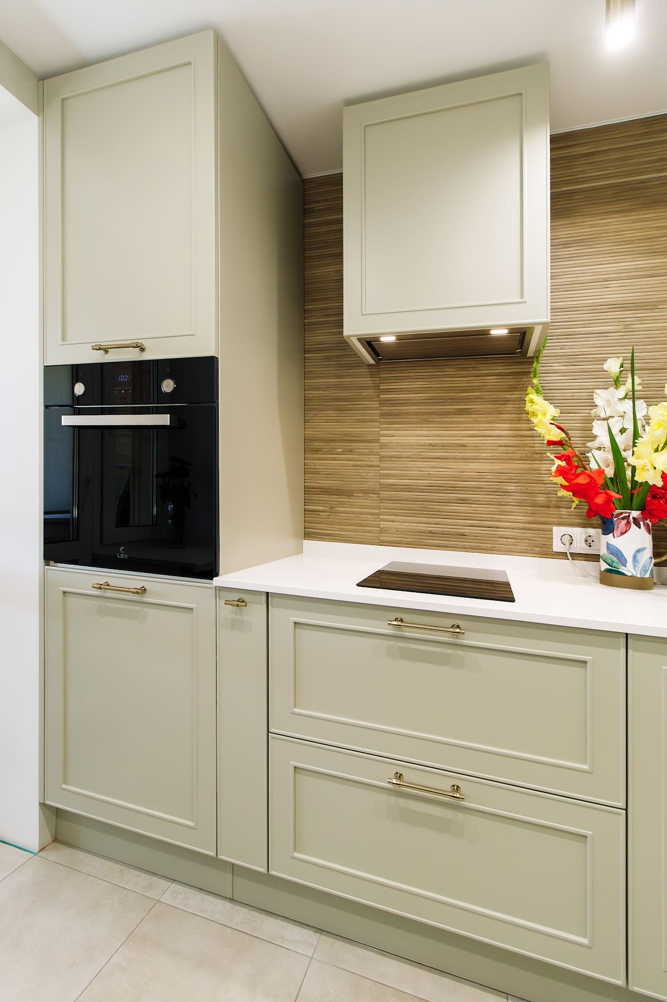- Материал фасадов — шпон окрашенный в нежный, зеленоватый оттенок.