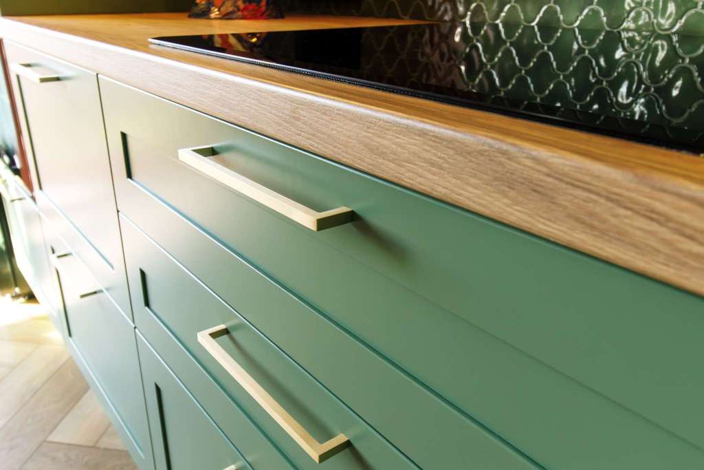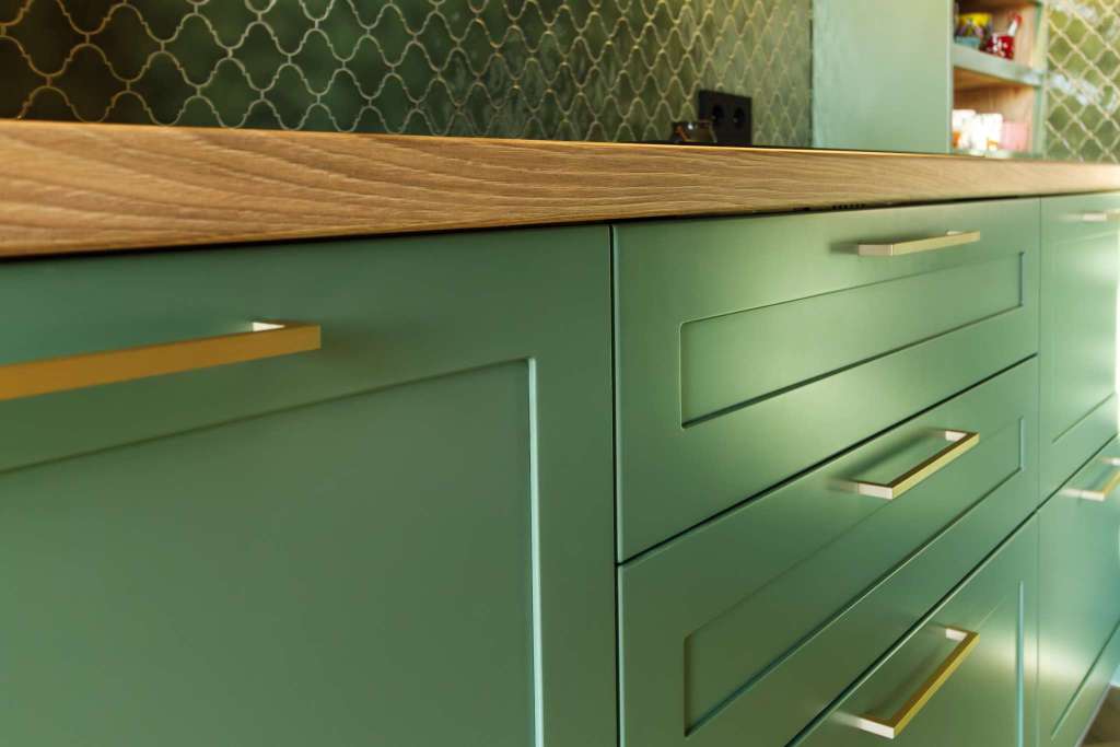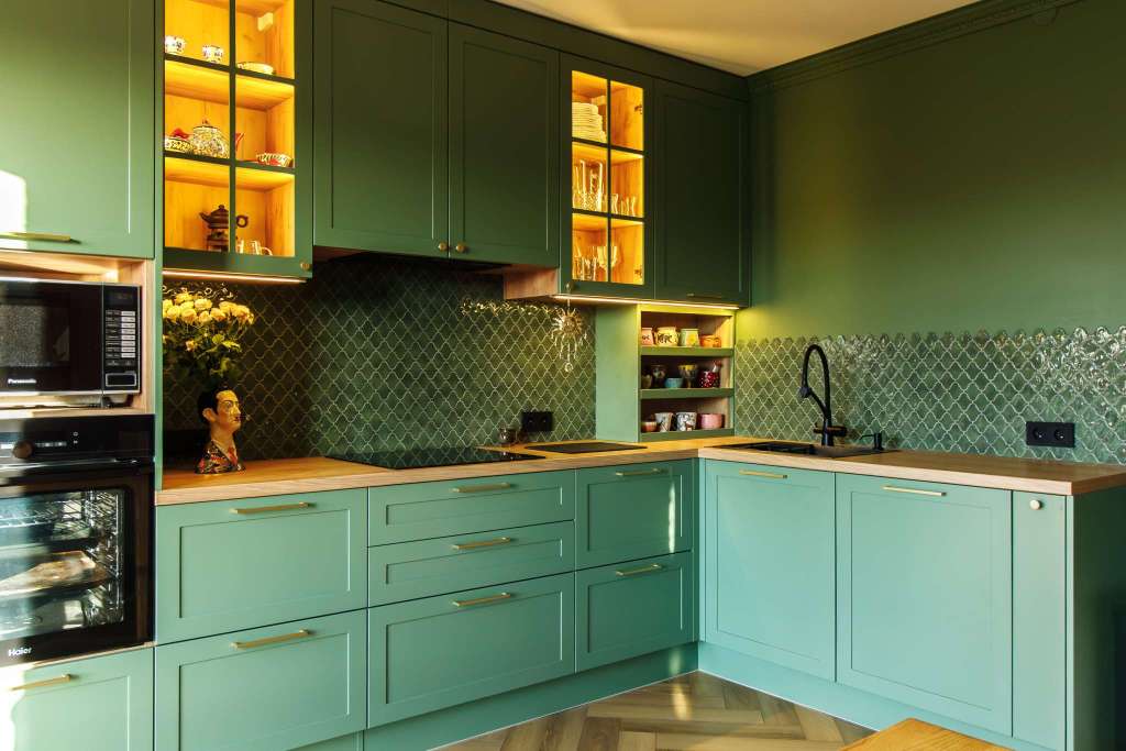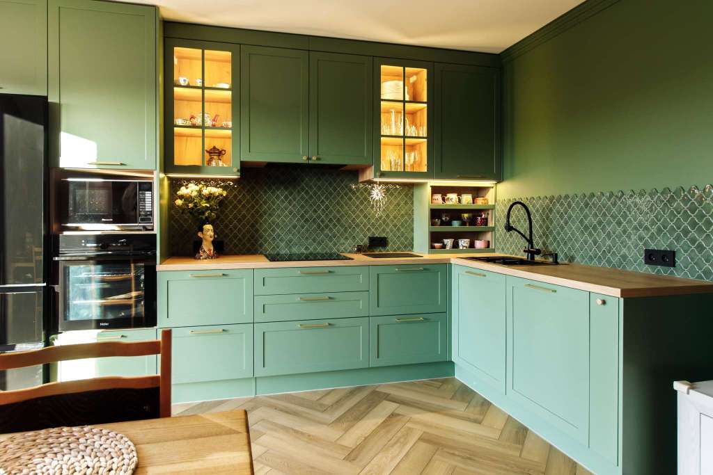 - Лаконичные фасады в необычном зелёном цвете.