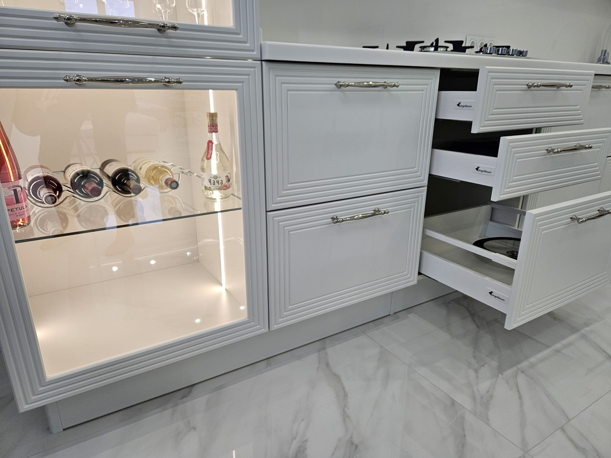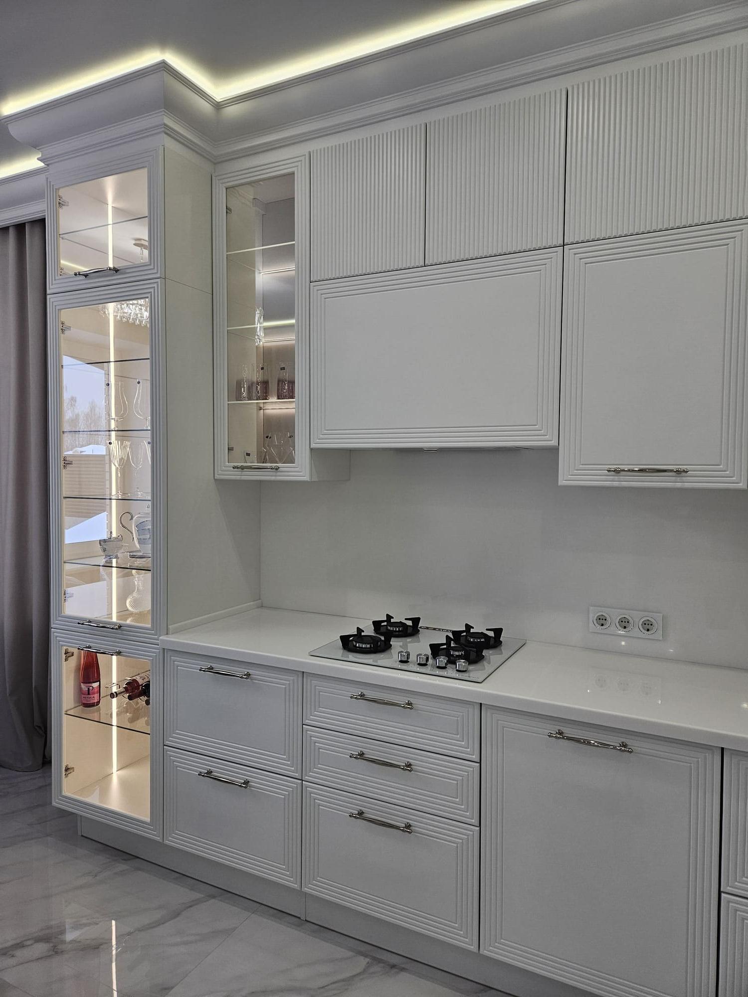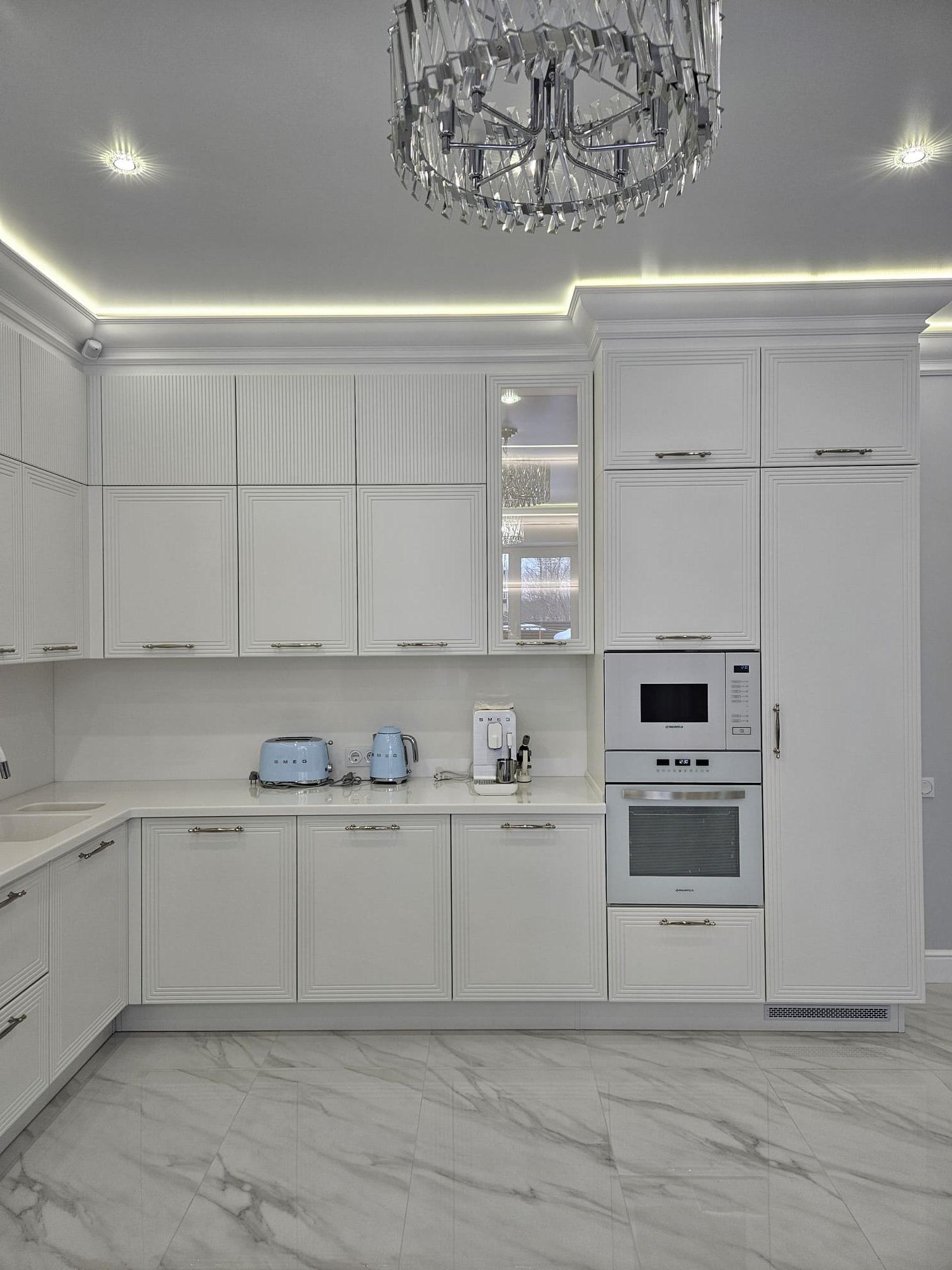 Фасады покрытые цветной эмалью с индивидуальной фрезеровкой, объединяющей всю кухню в единое целое.